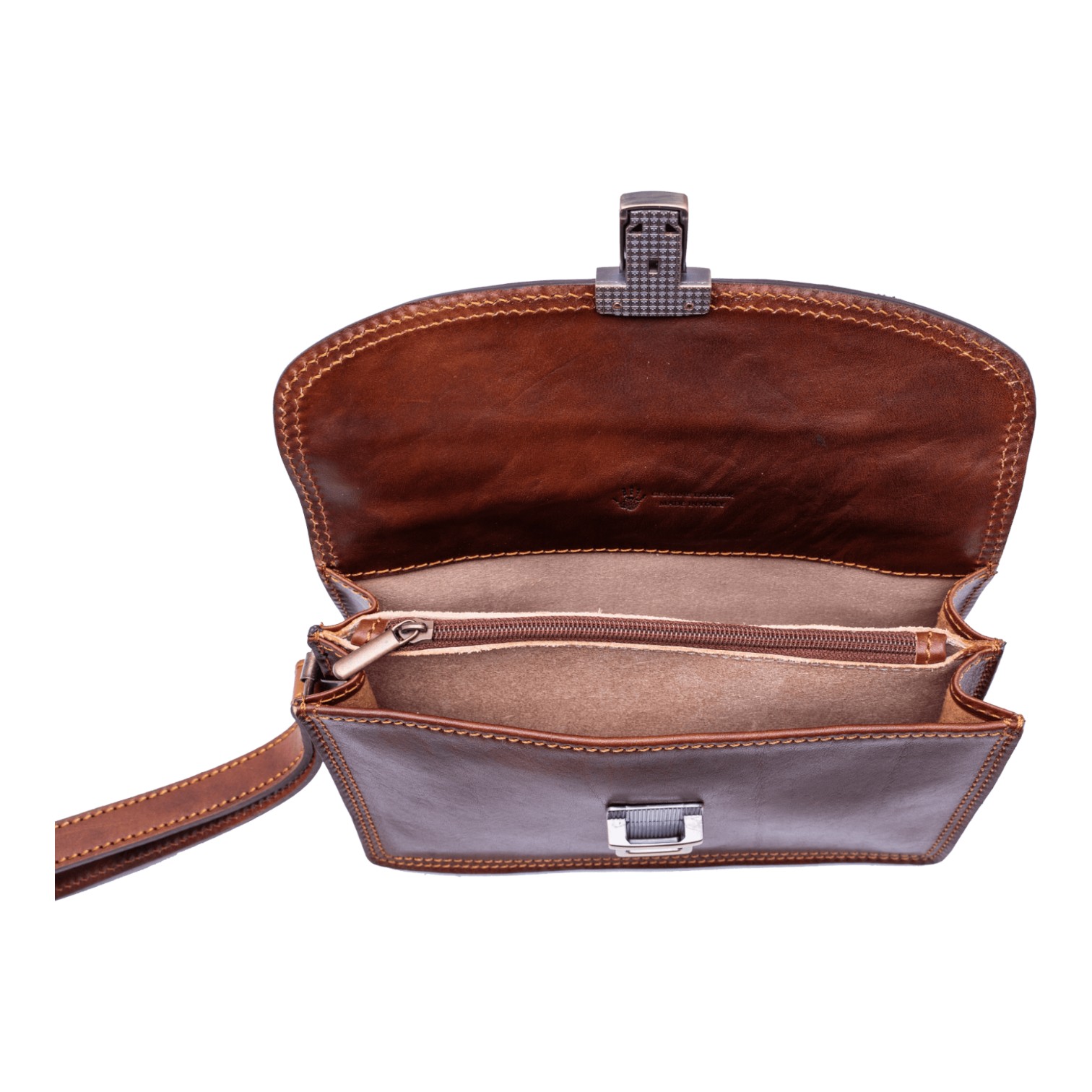 Borseta de mana, din piele naturala, cu doua compartimente separate de un buzunar cu fermoar, inchidere cu capac si accesoriu metalic, greutate 0,3kg. Made in Italy