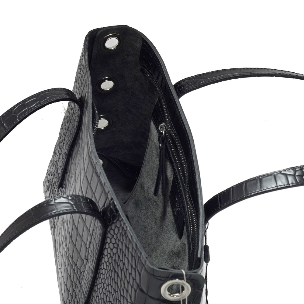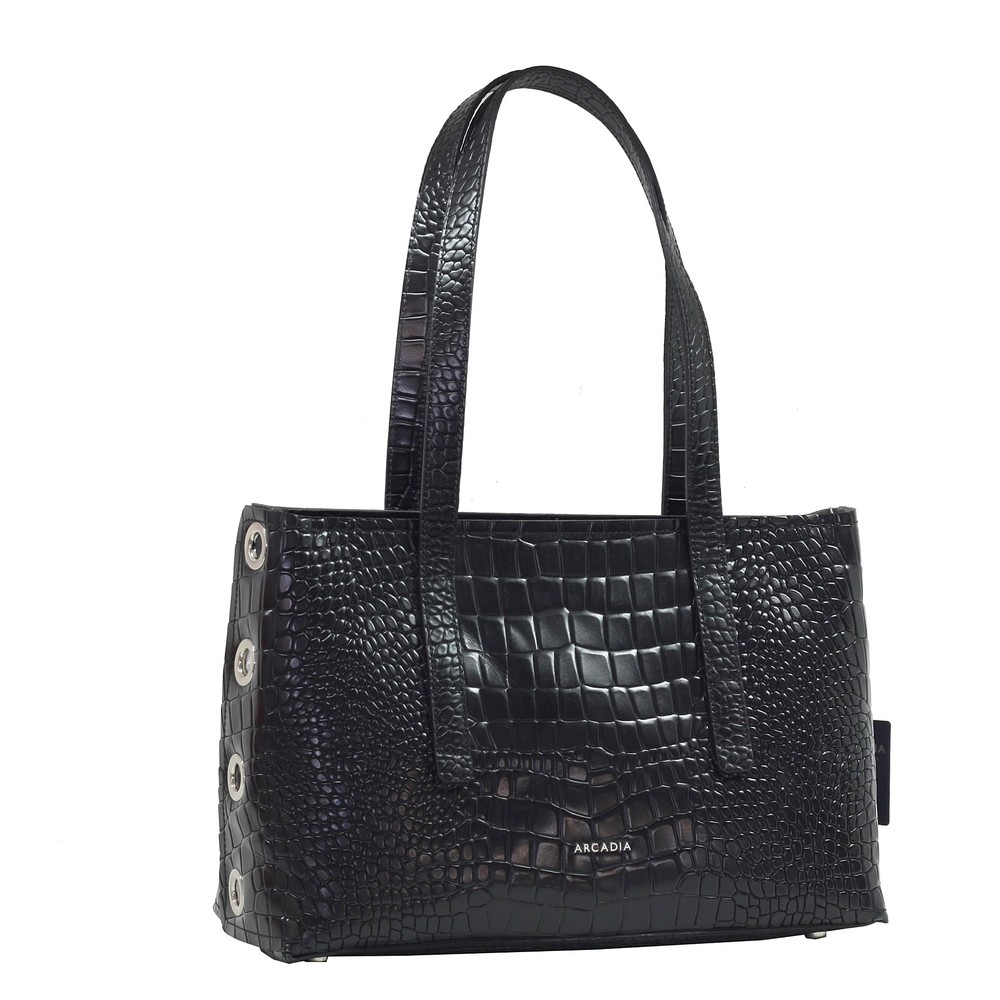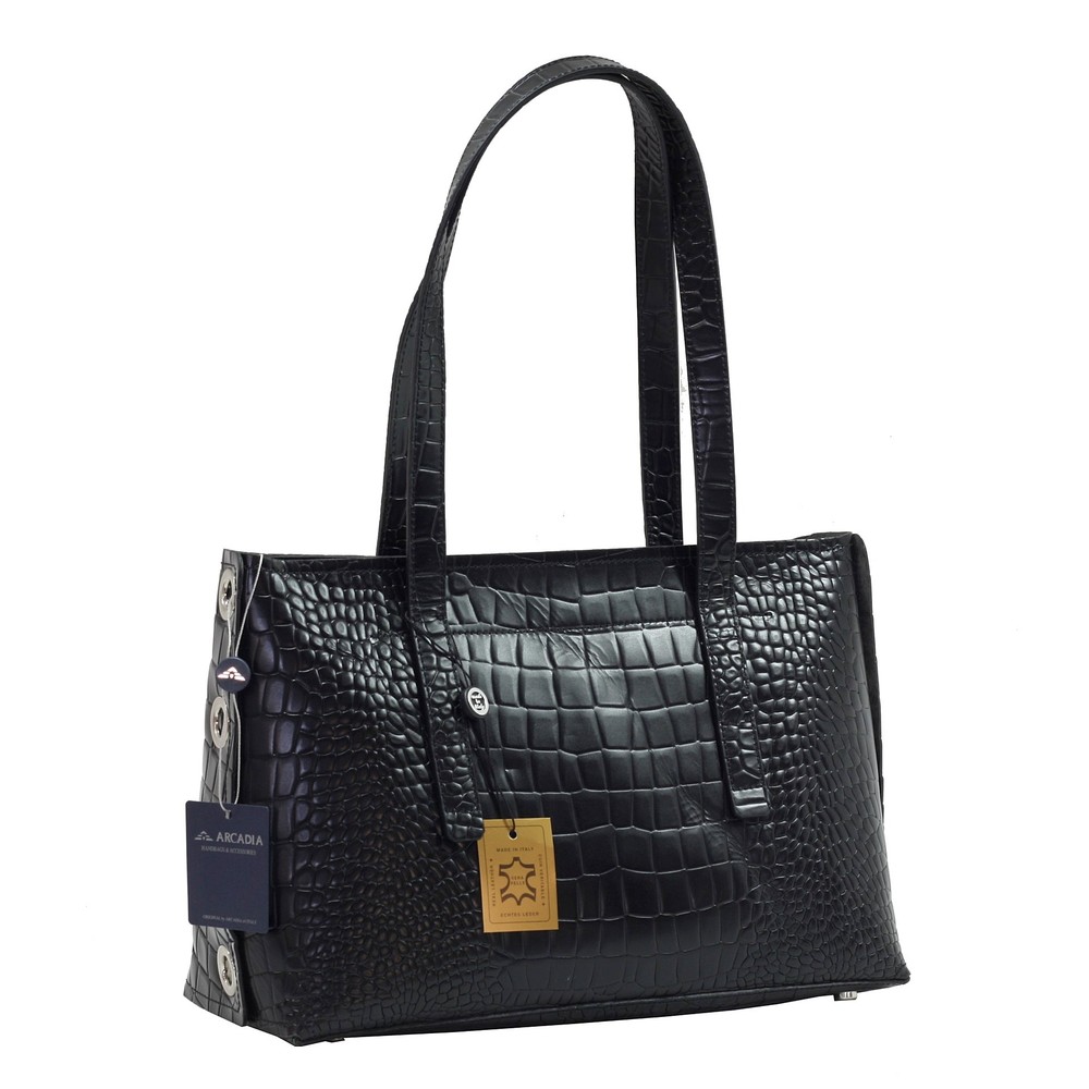 Geanta de dama Arcadia din piele naturala, cu un compartiment inchis cu fermoar, buzunare interioare multifunctionale pe captuseala, doua manere fixe din piele naturala, accesorii argintii. Made in Italy