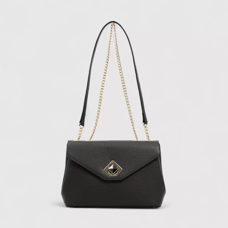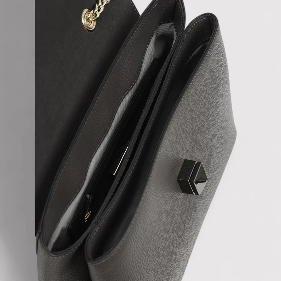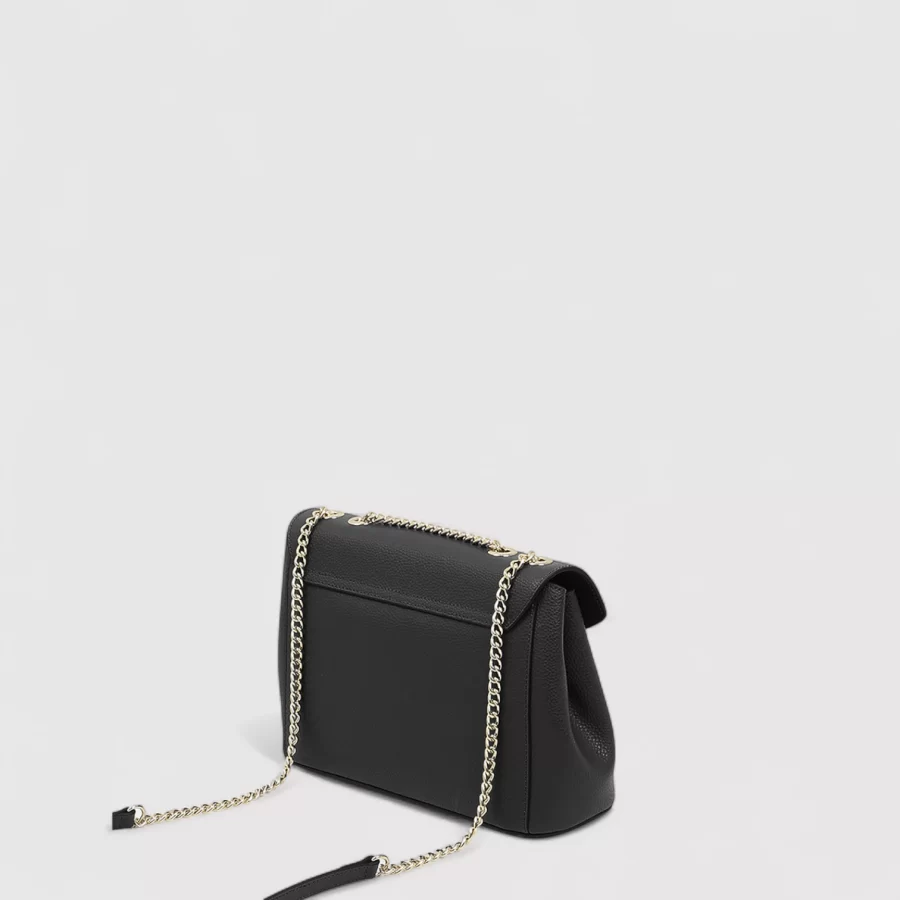 Geanta eleganta CROMIA din piele naturala, la interior are doua compartimente delimitate de un buzunar, buzunare multifunctionale pe captuseala, inchidere cu capac si accesoriu rotativ, curea de umar, din lant si piele, dublu reglabil, accesorii aurii. Made in Italy