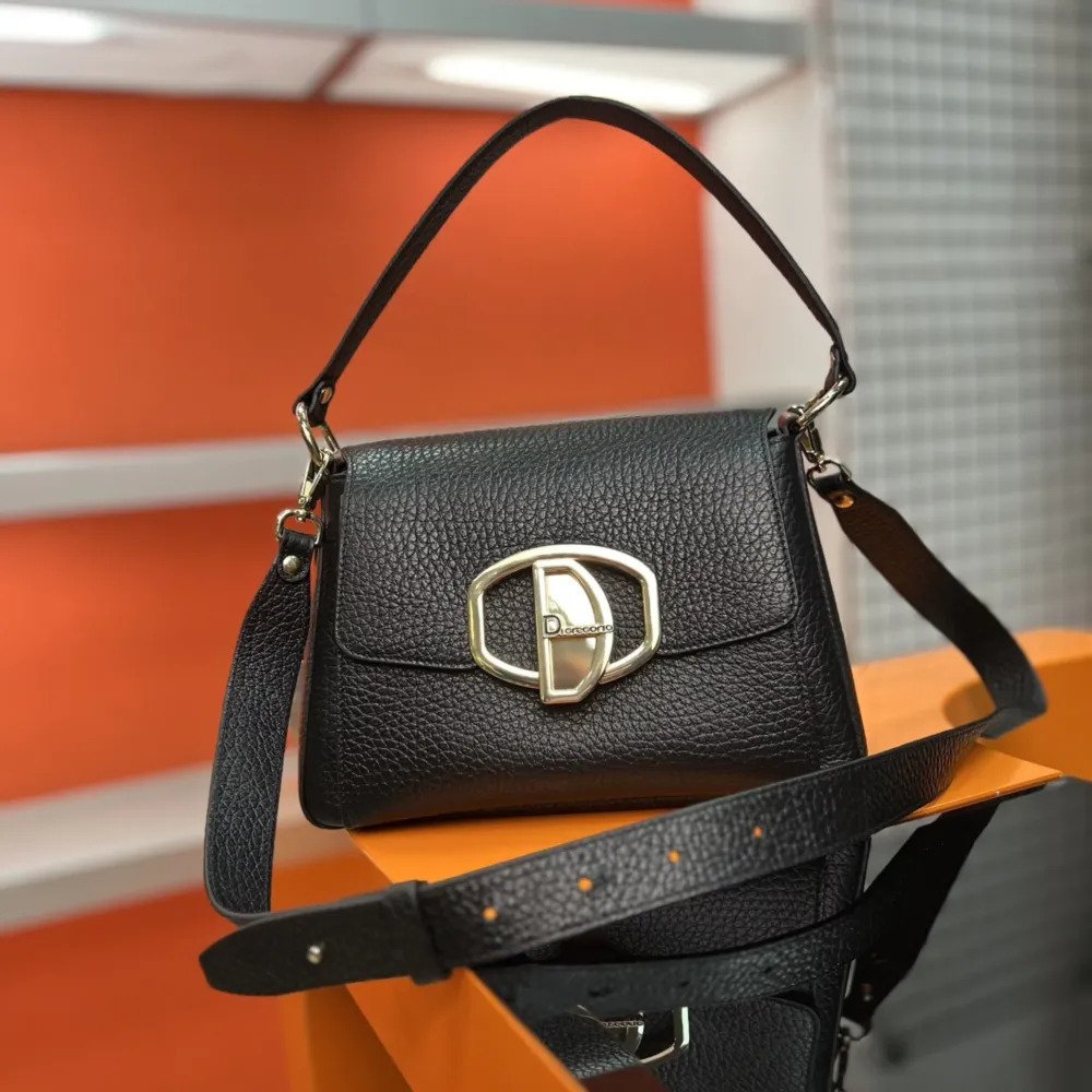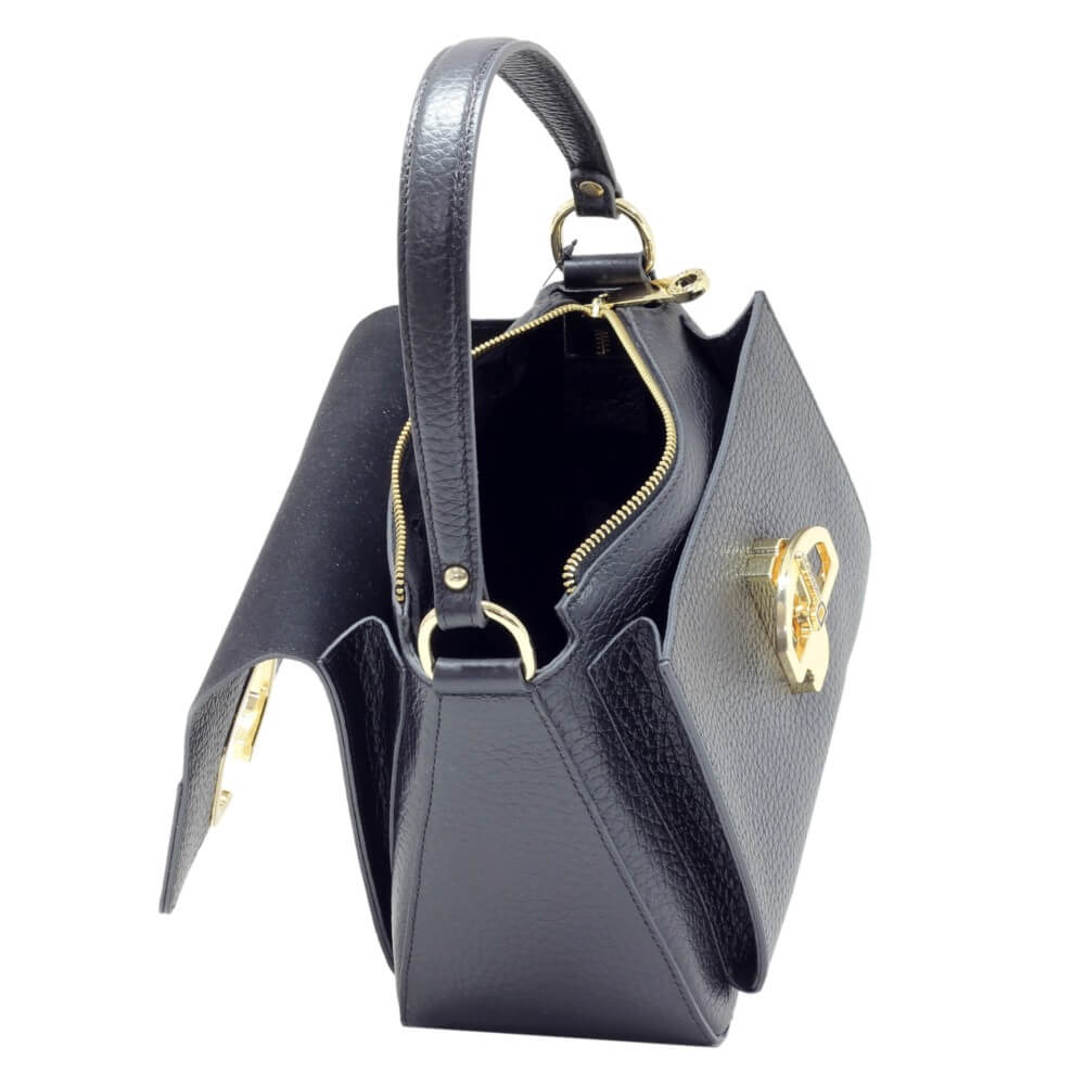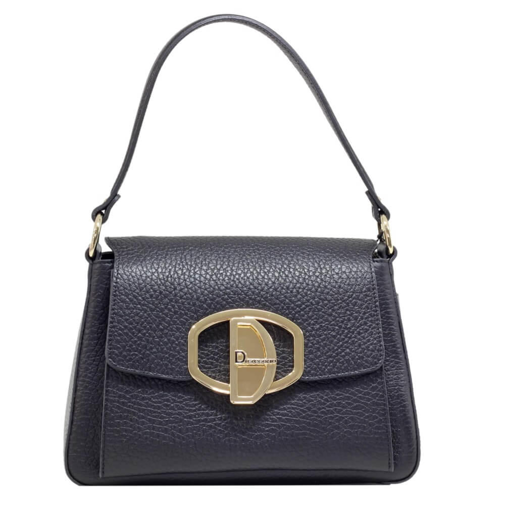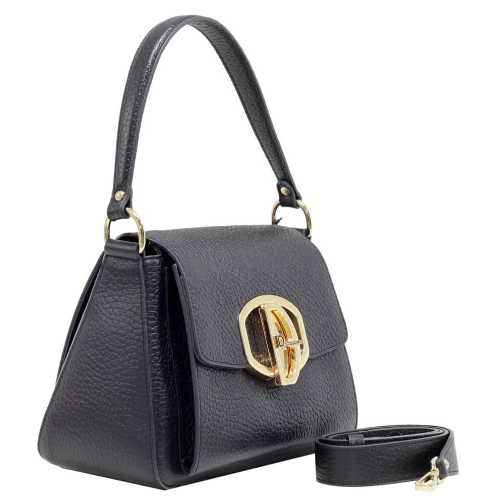 Geanta de dama DiGregorio din piele naturala, la interior are trei compartimente din care cel central inchis cu fermoar, buzunare interioare multifunctionale, inchidere cu capac si accesoriu rotativ, curea de umar, reglabila si detasabila, accesorii aurii. Made in Italy