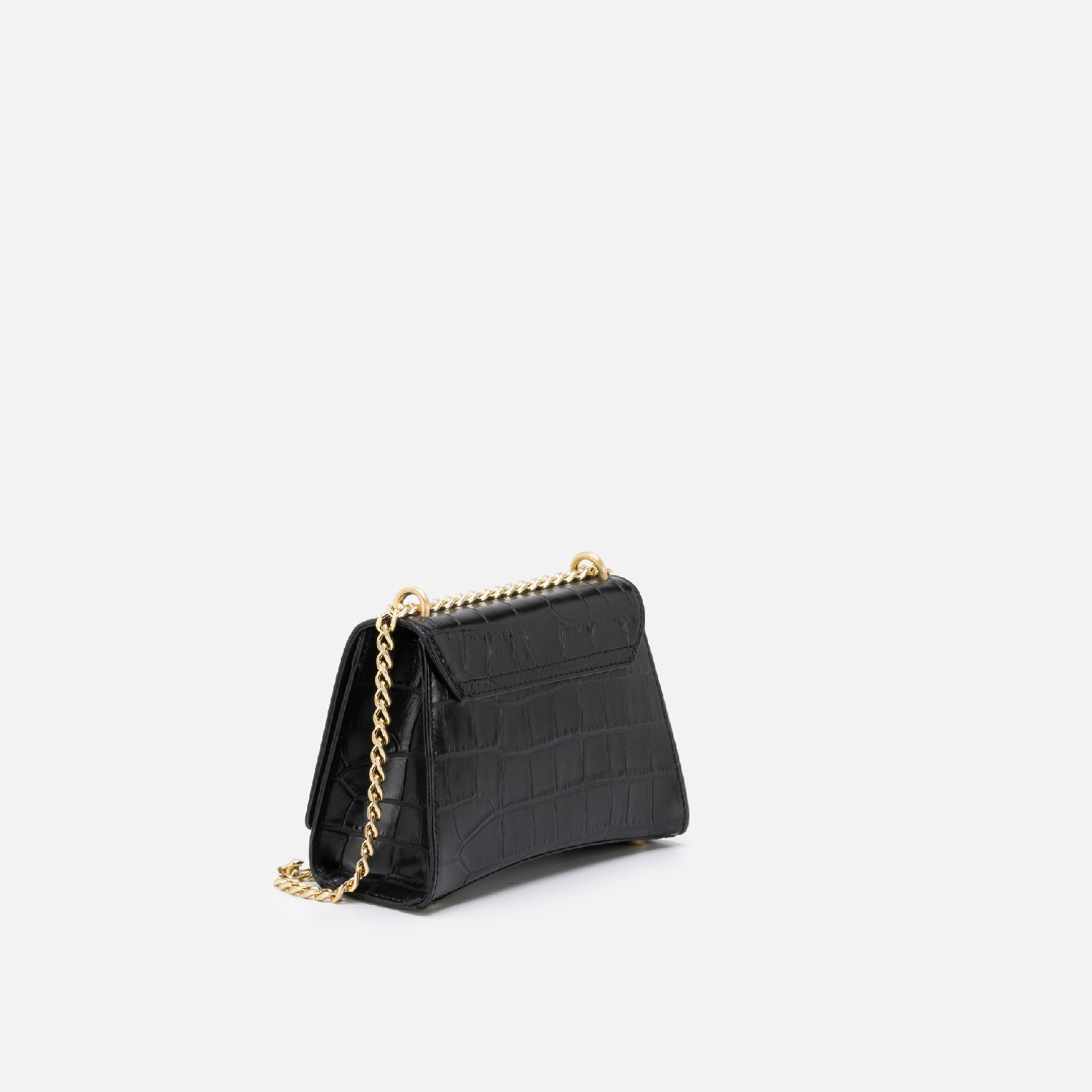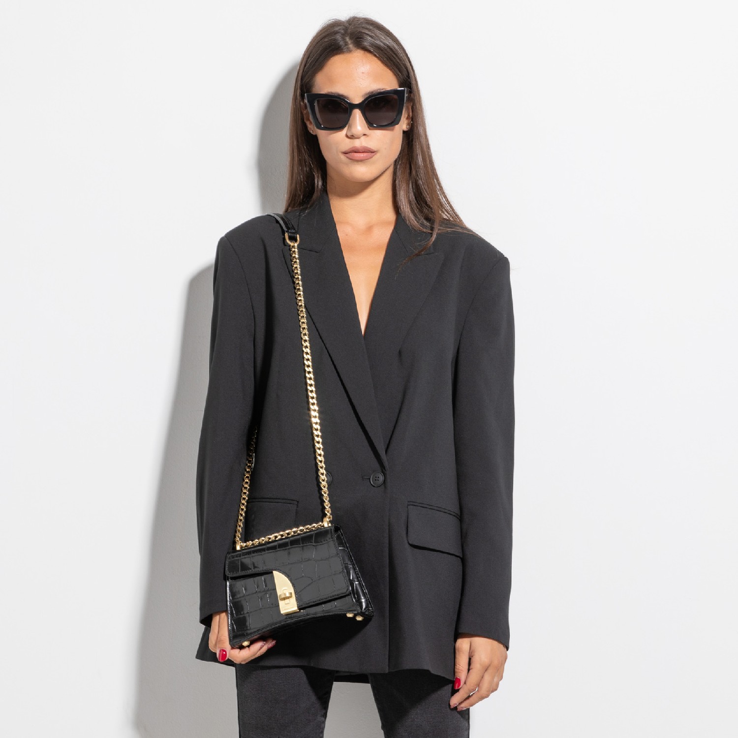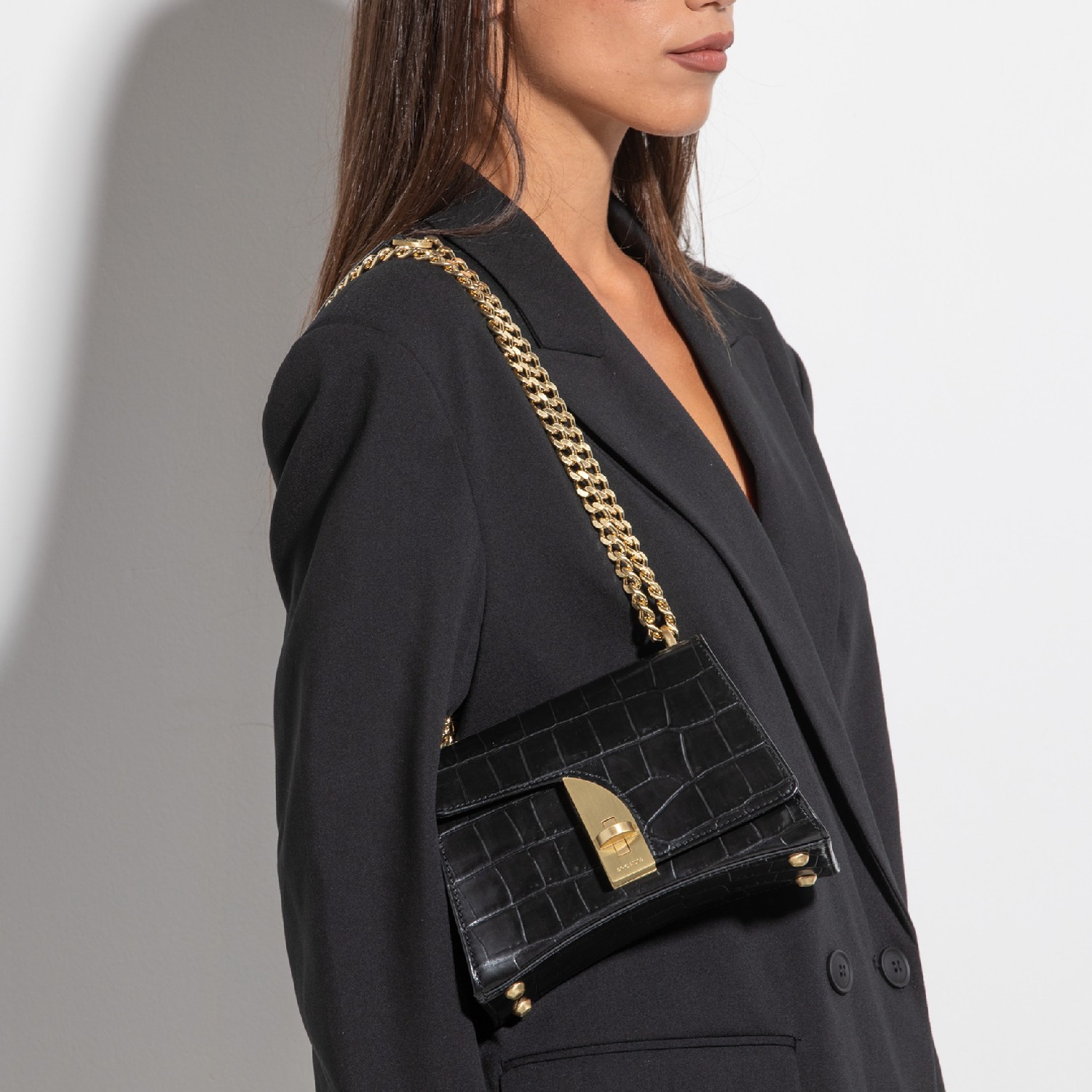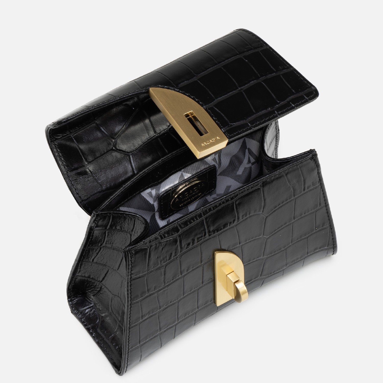 Geanta de umar ARCADIA din piele naturala, cu un compartiment inchis cu capac si accesoriu rotativ, buzunare multifunctionale pe captuseala, curea de umar, dublu reglabil, accesorii aurii. Made in Italy