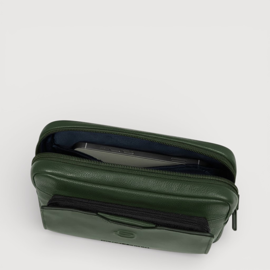 Geanta de umar PIQUADRO din piele naturala, cu un compartiment inchis cu fermoar, buzunare interioare cu protectie pentru un telefon, baterie, etc, sistem RFID, doua buzunar exterioare, curea de umar, reglabila si detasabila, maner de mana, detasabil, greutate 179 gr.