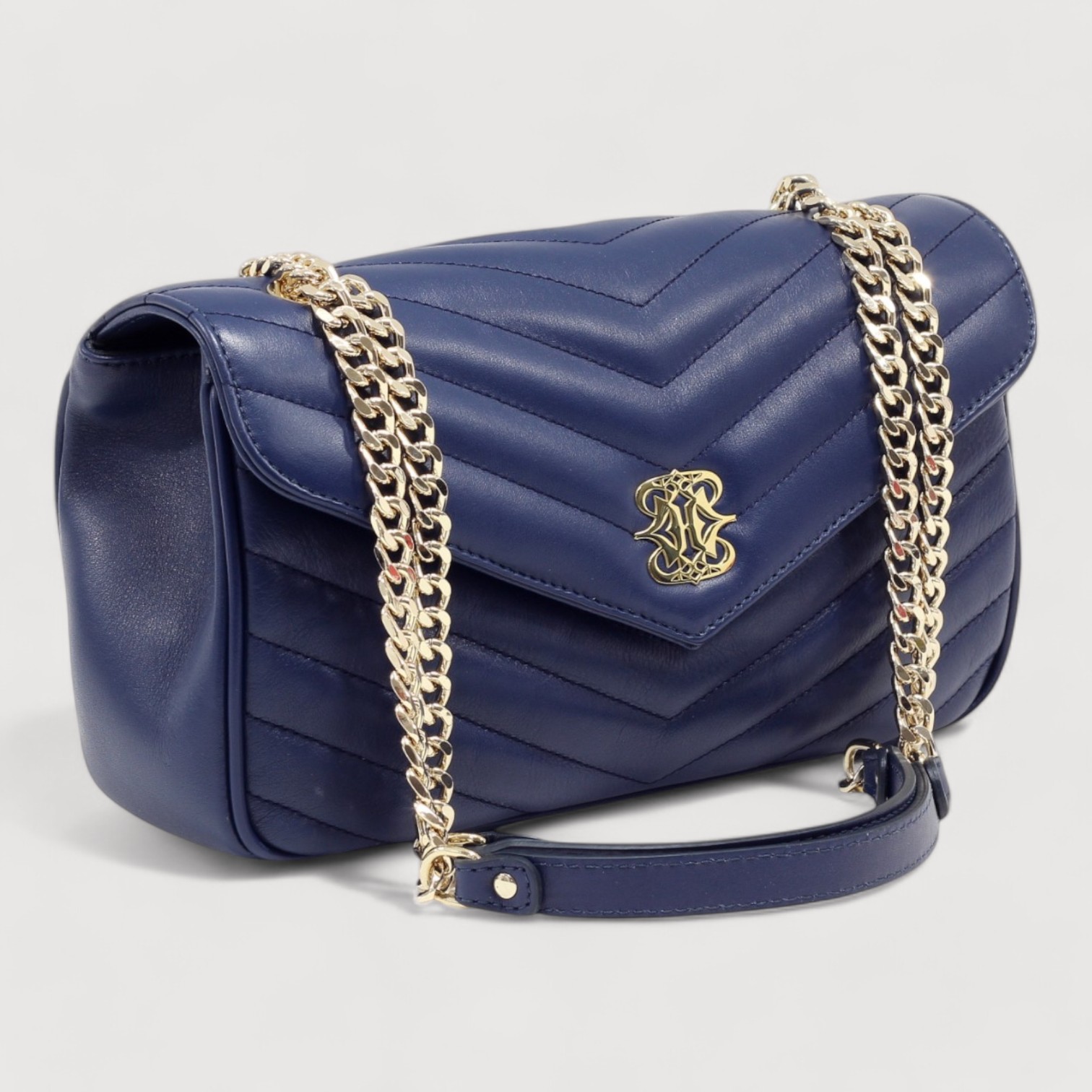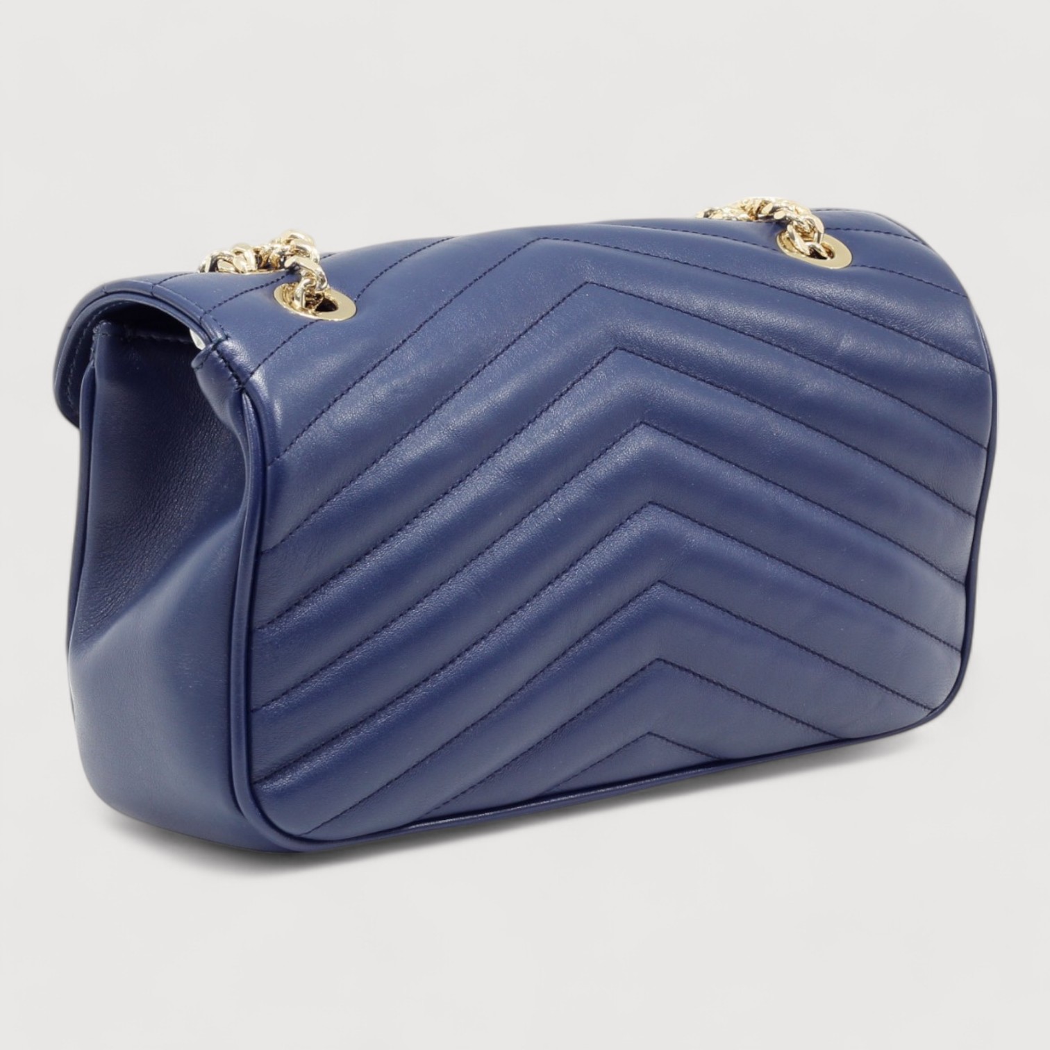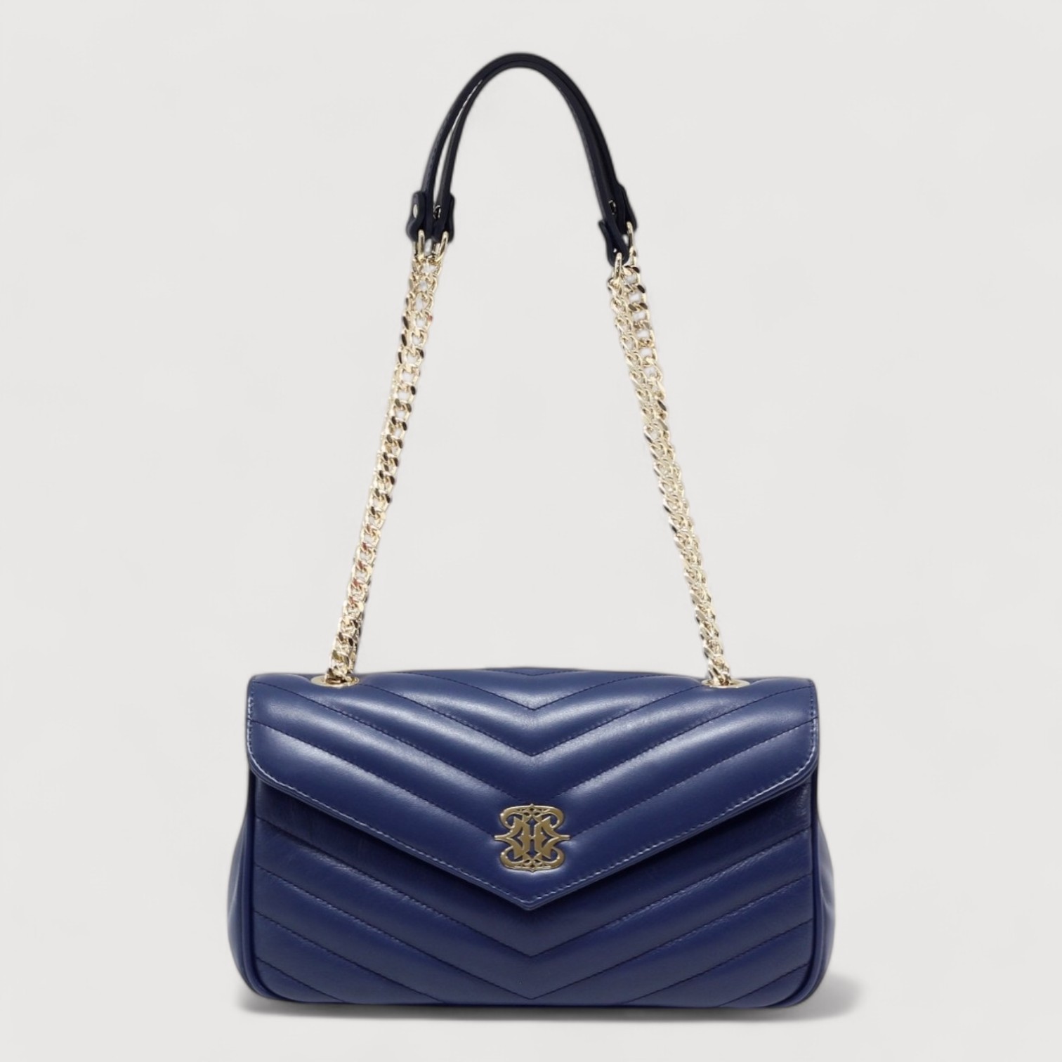 Geanta de umar RIPANI din piele naturala matlasata, la interior are doua compartimente delimitate de un buzunar cu fermoar, buzunare multifunctionale pe captuseala, inchidere cu capac si buton magnetic, curea de umar, dublu reglabil, din lant si piele, accesorii aurii. Made in Italy