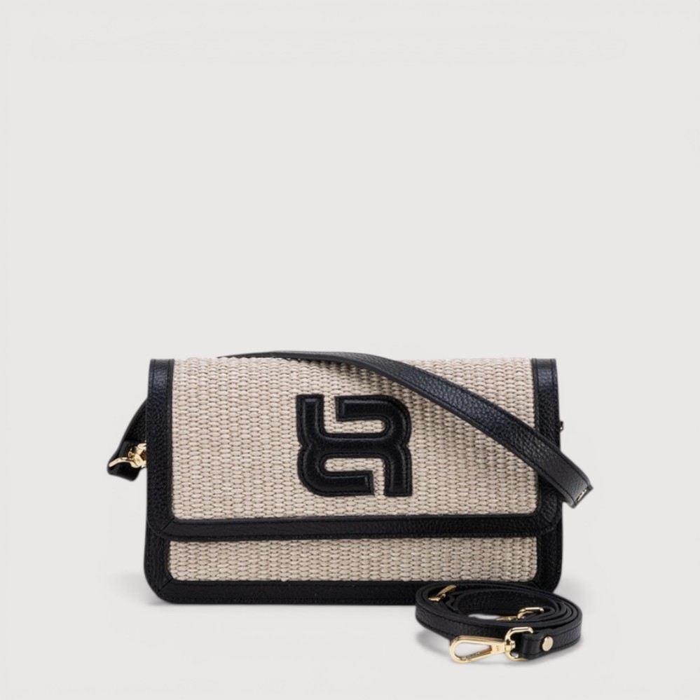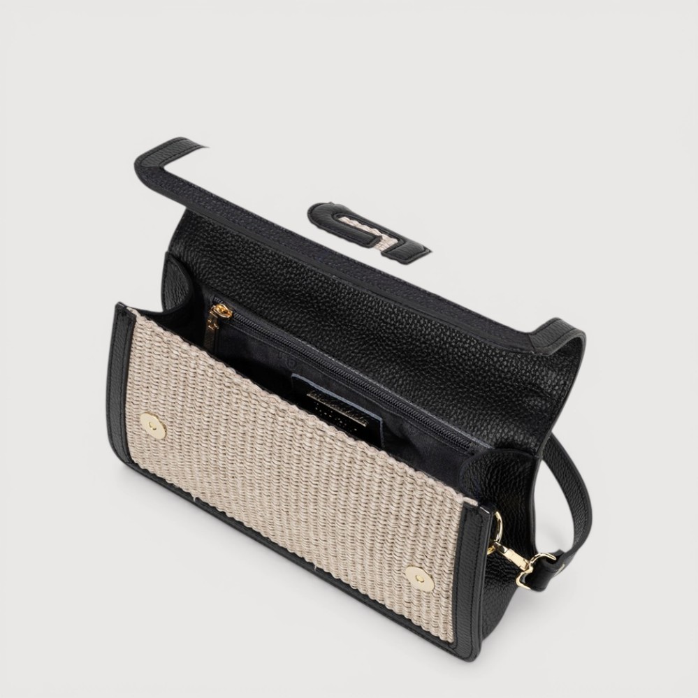 Geanta de umar RIPANI din piele naturala si pai, cu un compartiment inchis cu capac si doi butoni magnetici, curea scurta de umar, curea lunga, din piele, reglabila si detasabila, accesorii aurii. Made in Italy