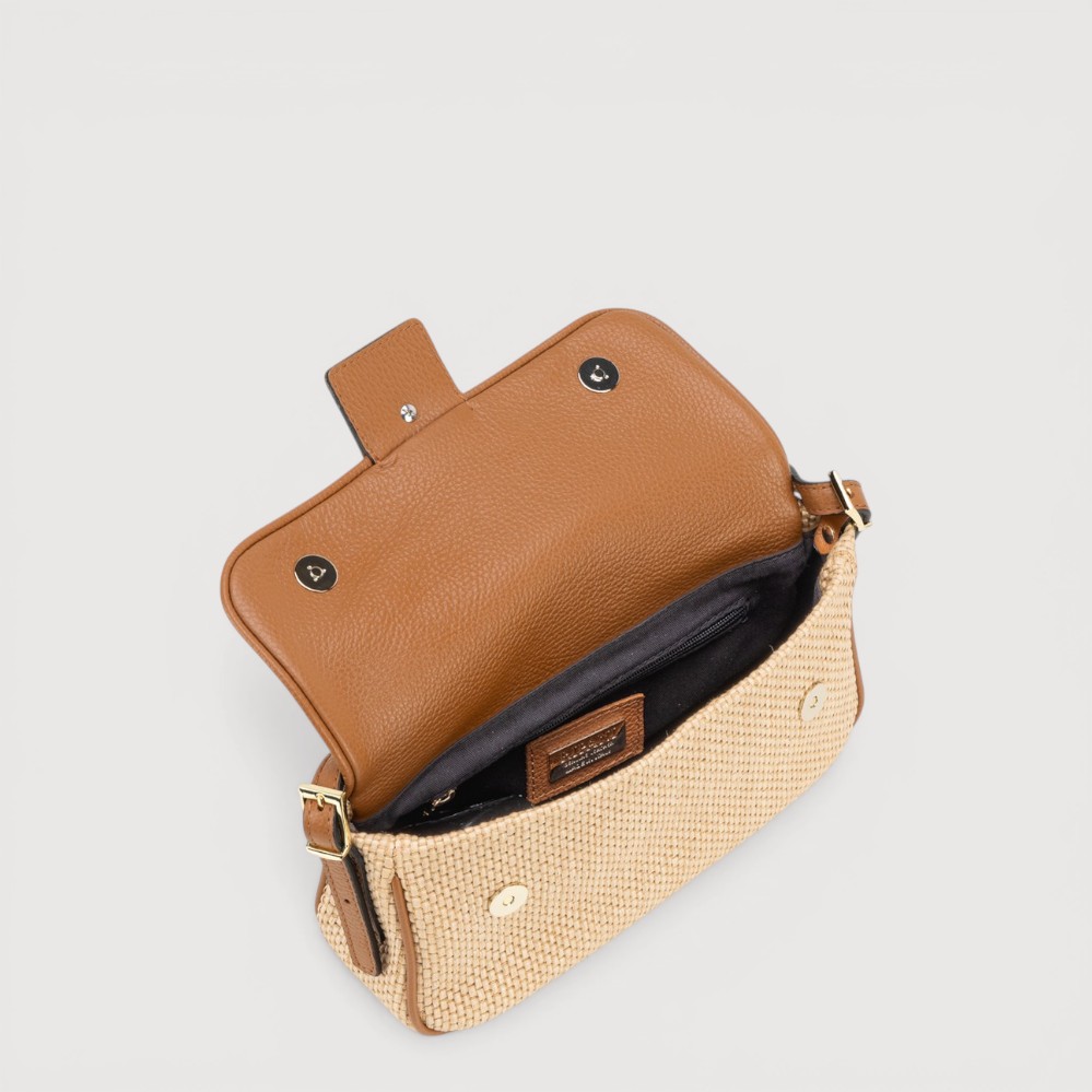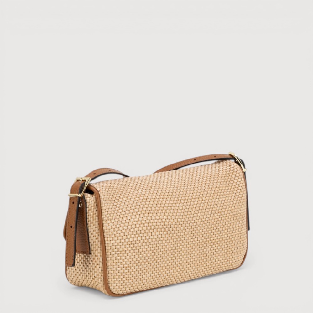 Geanta de umar RIPANI din piele naturala si rafie, cu un compartiment inchis cu capac si doi butoni magnetici, buzunare interioare multifunctionale, curea de umar, reglabila, accesorii aurii. Made in Italy