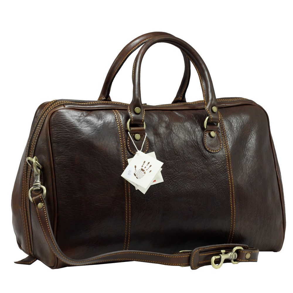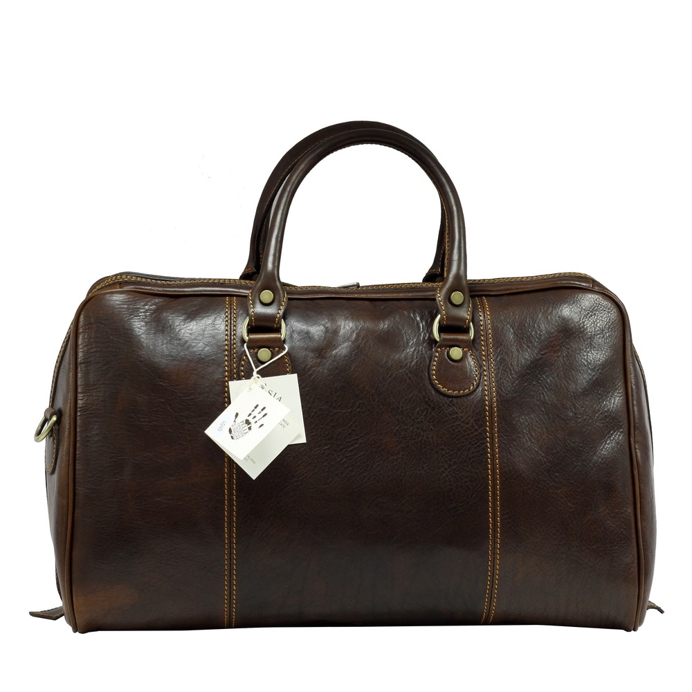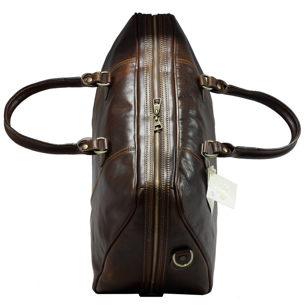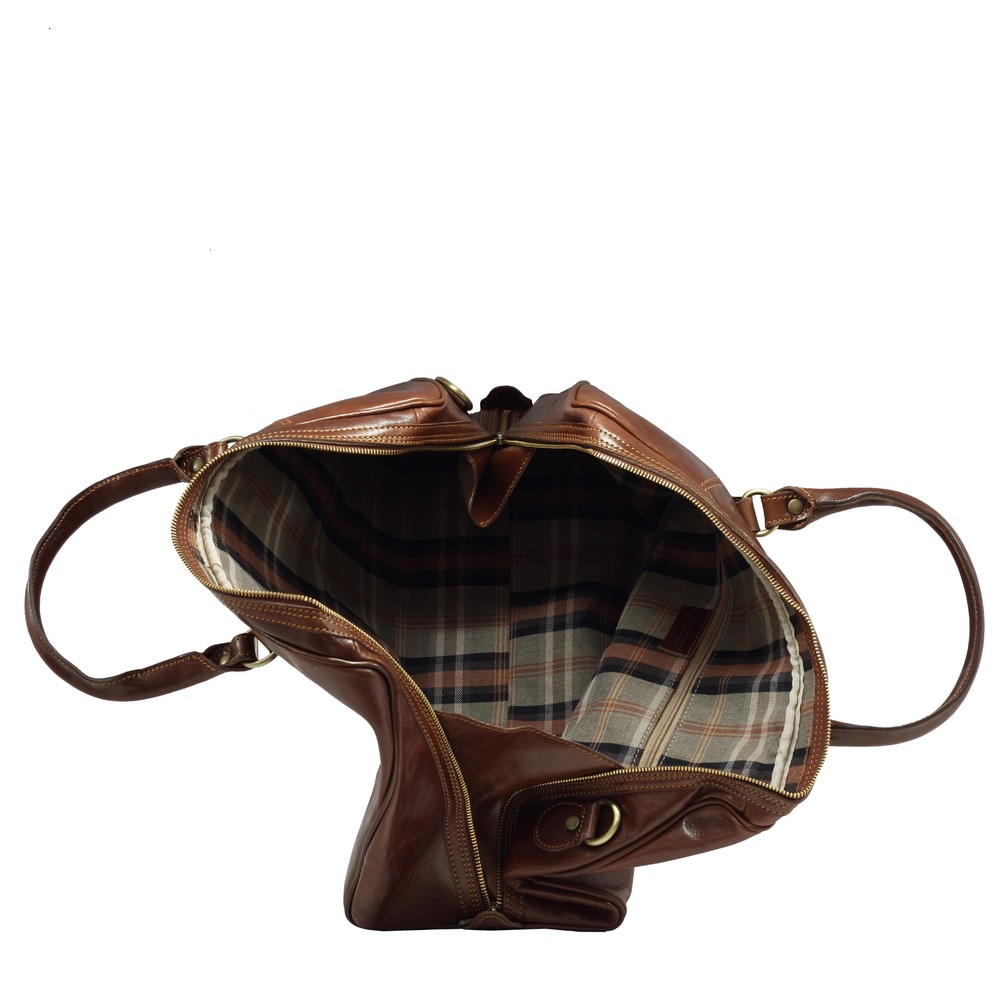 Geanta de voiaj din piele naturala vachetta, un compartiment inchis cu fermoar, buzunar interior, curea de umar din piele reglabila si detasabila, captuseala din bumbac, greutate 1,4 kg. Made in Italy.