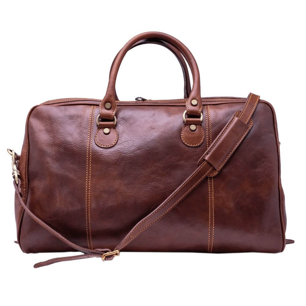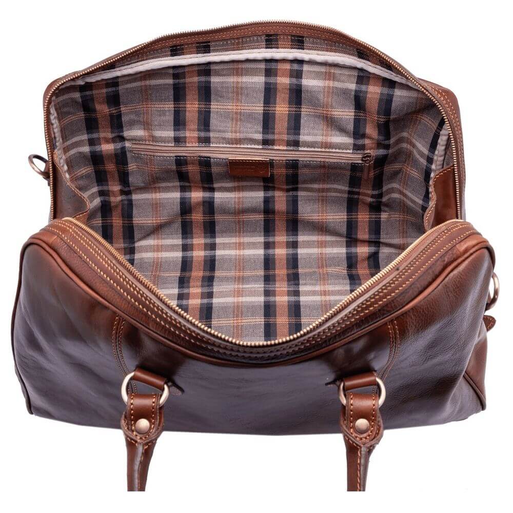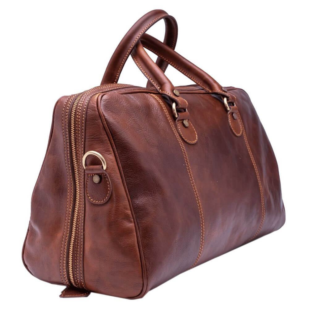 Geanta de voiaj din piele naturala vachetta, un compartiment inchis cu fermoar, buzunar interior, curea de umar din piele reglabila si detasabila, captuseala din bumbac, greutate 1,4 kg. Made in Italy.