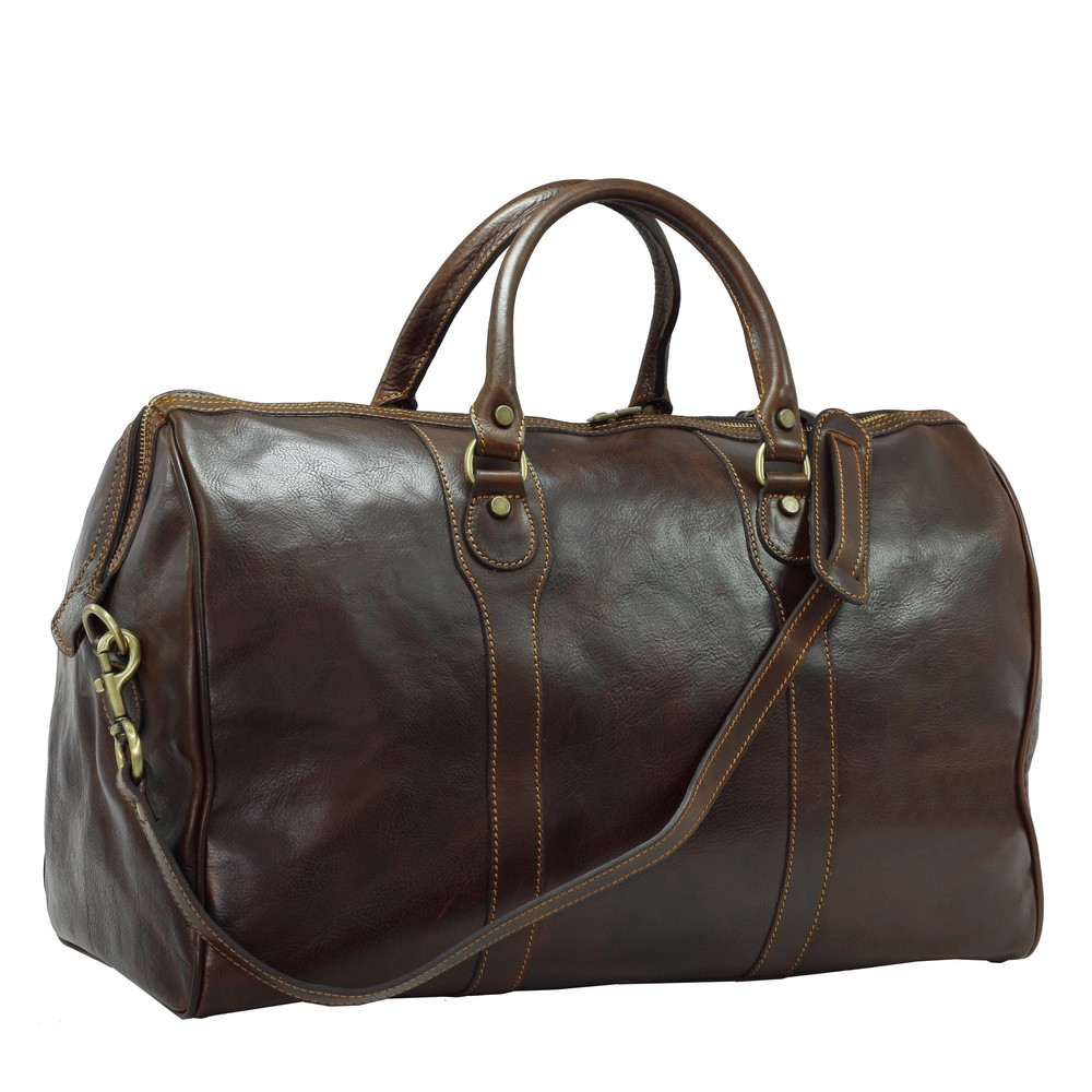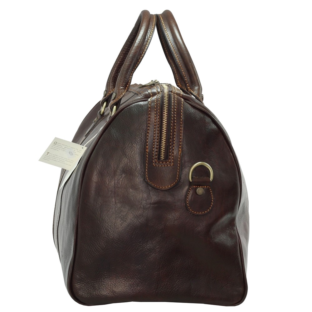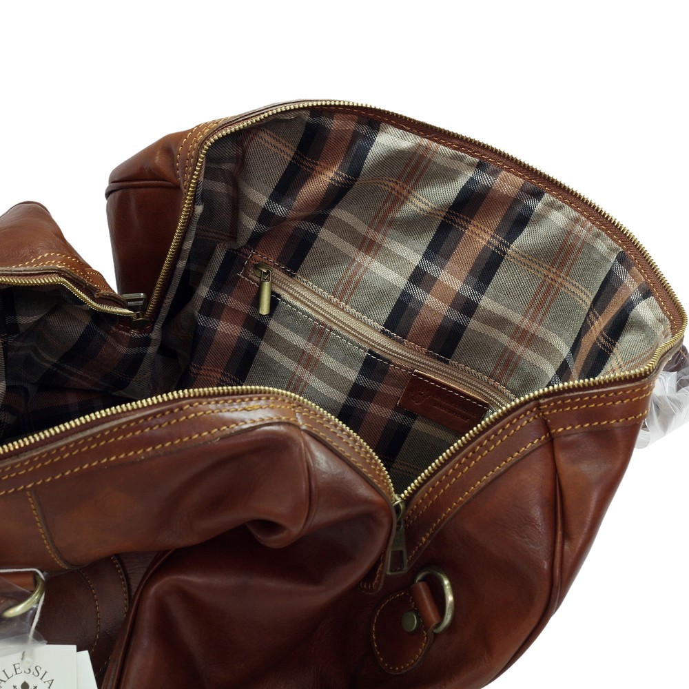 Geanta de voiaj din piele naturala vachetta, un compartiment inchis cu fermoar, curea de umar din piele reglabila si detasabila, captuseala de bumbac, buzunar interior, fermoar YKK, greutate 1,5 kg. Made in Italy.