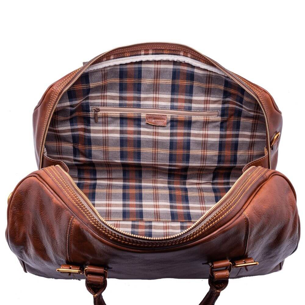 Geanta de voiaj din piele naturala vachetta, cu un compartiment, buzunar interior, captuseala din bumbac, inchidere cu fermoar plus 2 curele verticale care se inchid cu o catarama, fermoar YKK, greutate 1,7 kg. Made in Italy.
