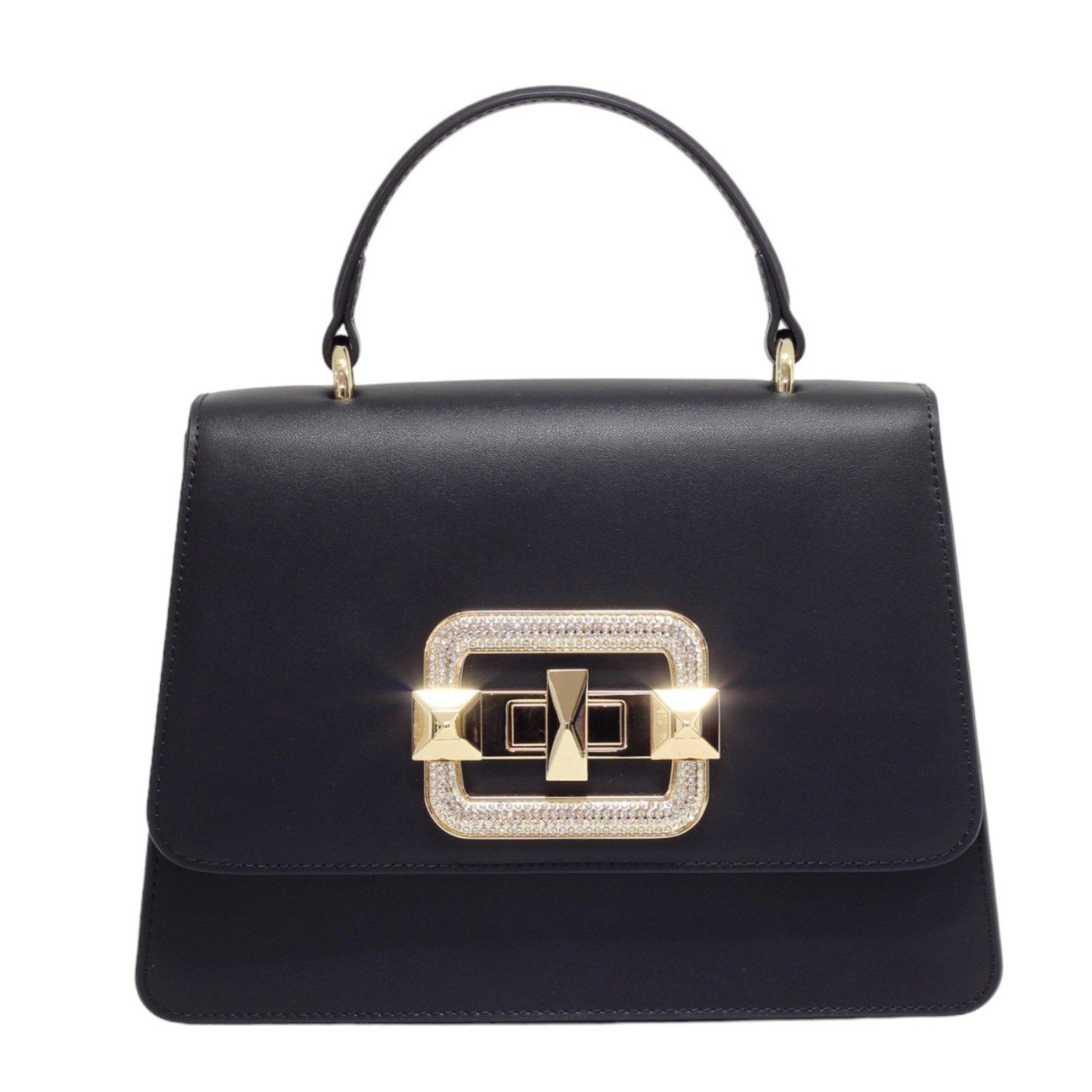Geanta de mana CROMIA din piele naturala, cu un compartiment inchis cu capac si accesoriu ( acoperit cu cristale) rotativ, buzunare interioare multifunctionale, curea de umar, din piele, reglabila si detasabila, accesorii aurii. Made in Italy