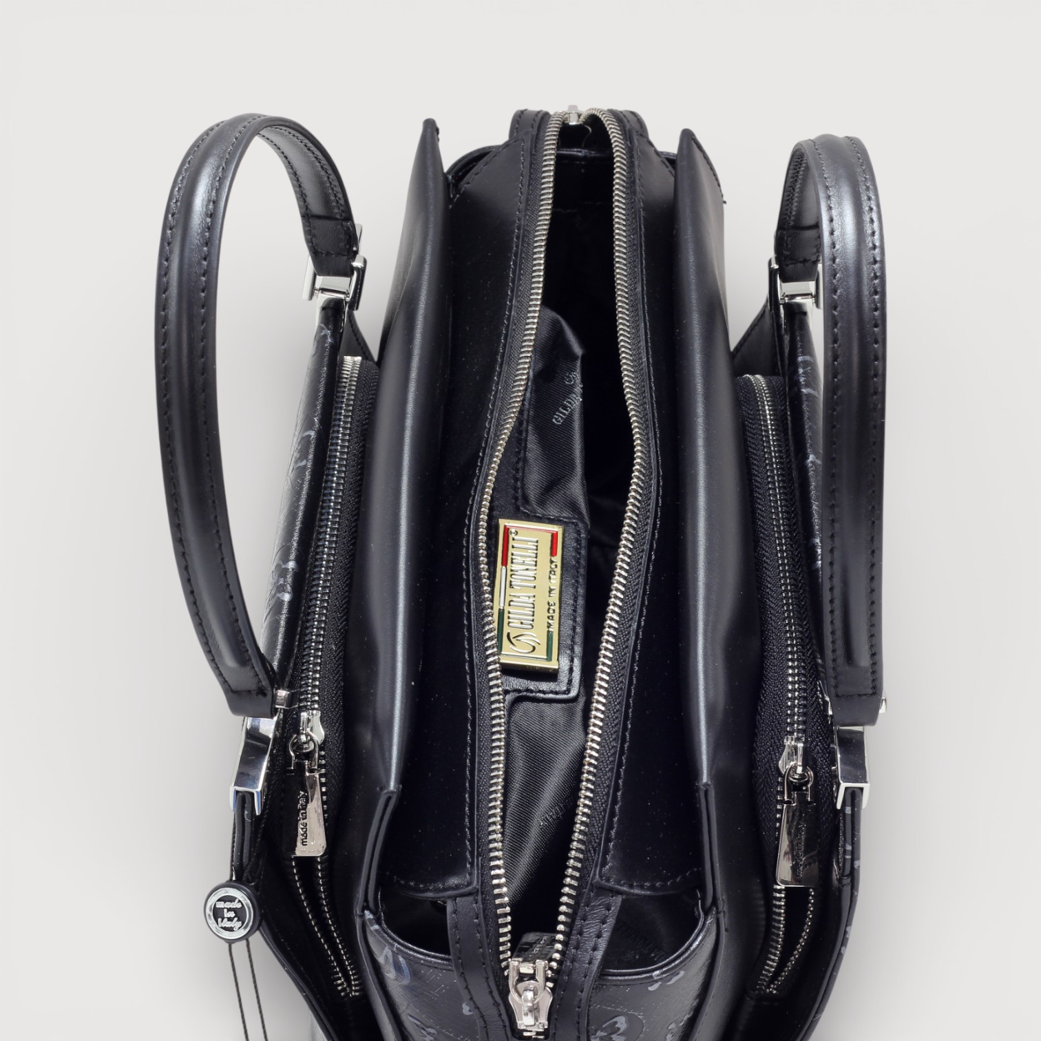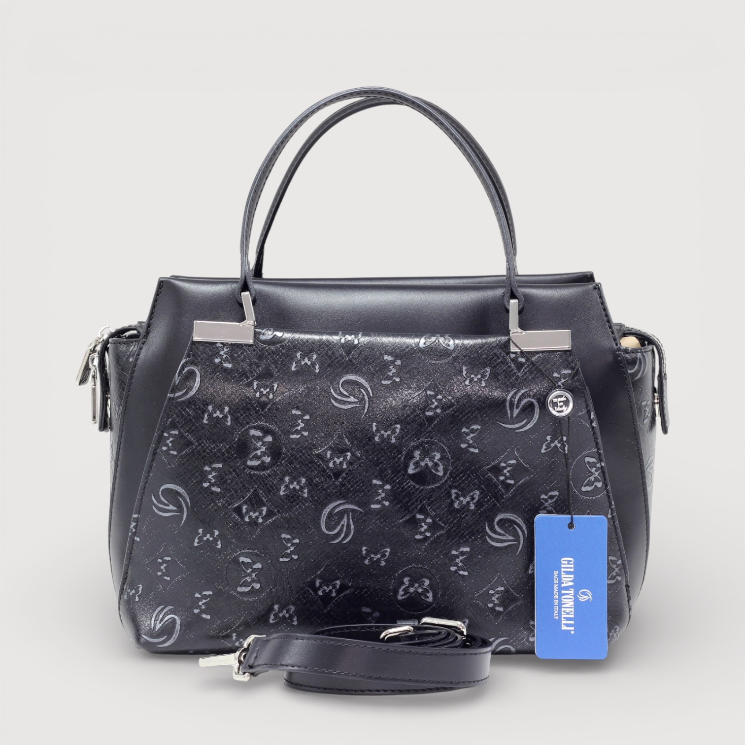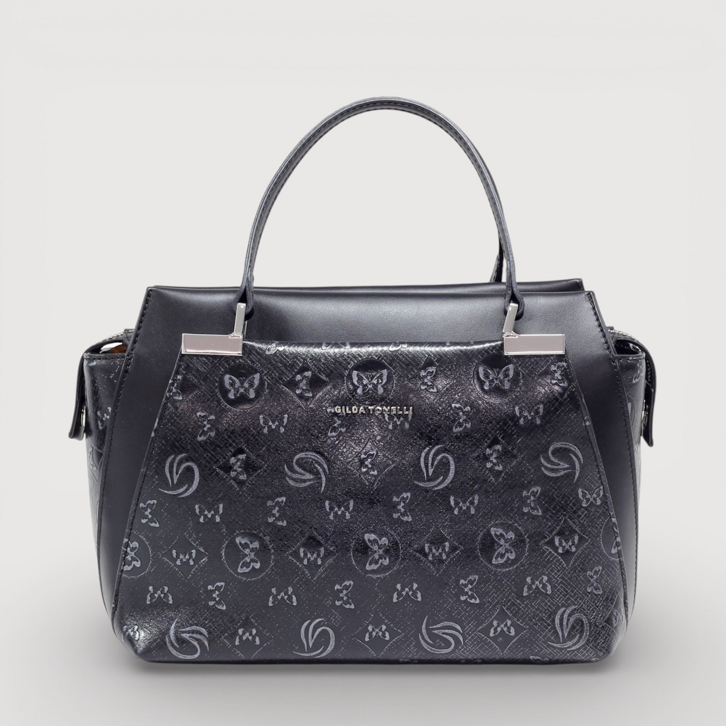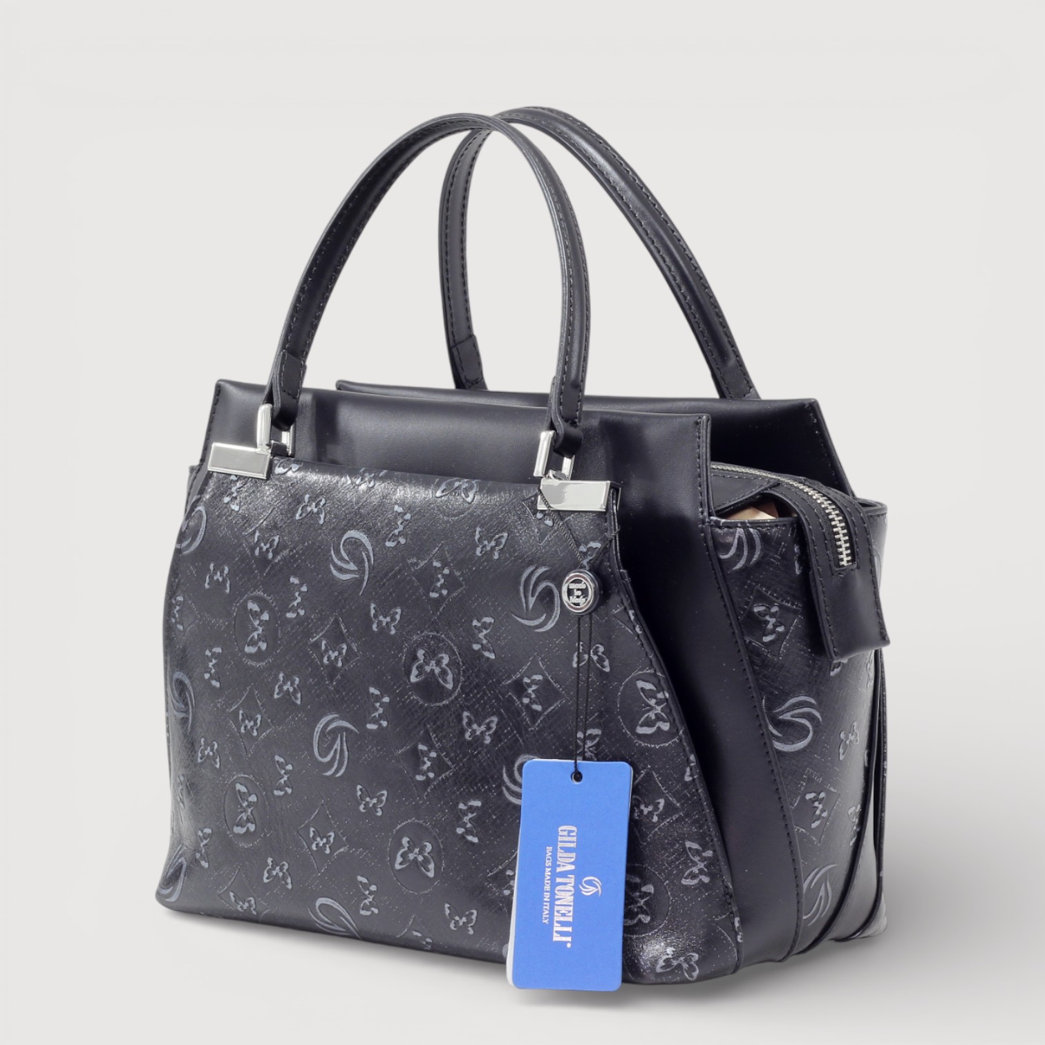 Geanta eleganta Gilda Tonelli din piele naturala, cu un compartiment central inchis cu fermoar, buzunare interioare multifunctionale plus doua exterioare, accesorii argintii, curea de umar, din piele, reglabila si detasabila. Made in Italy