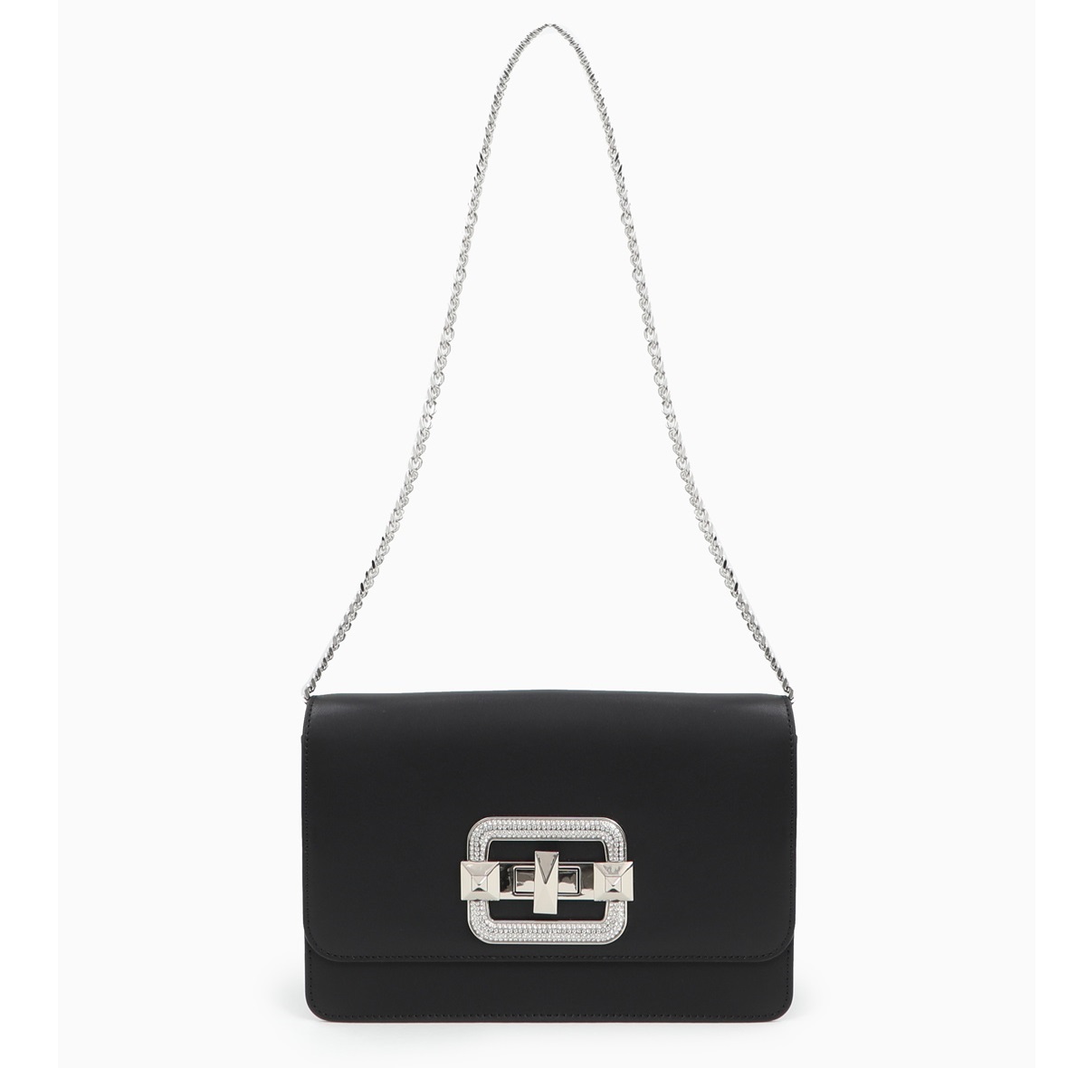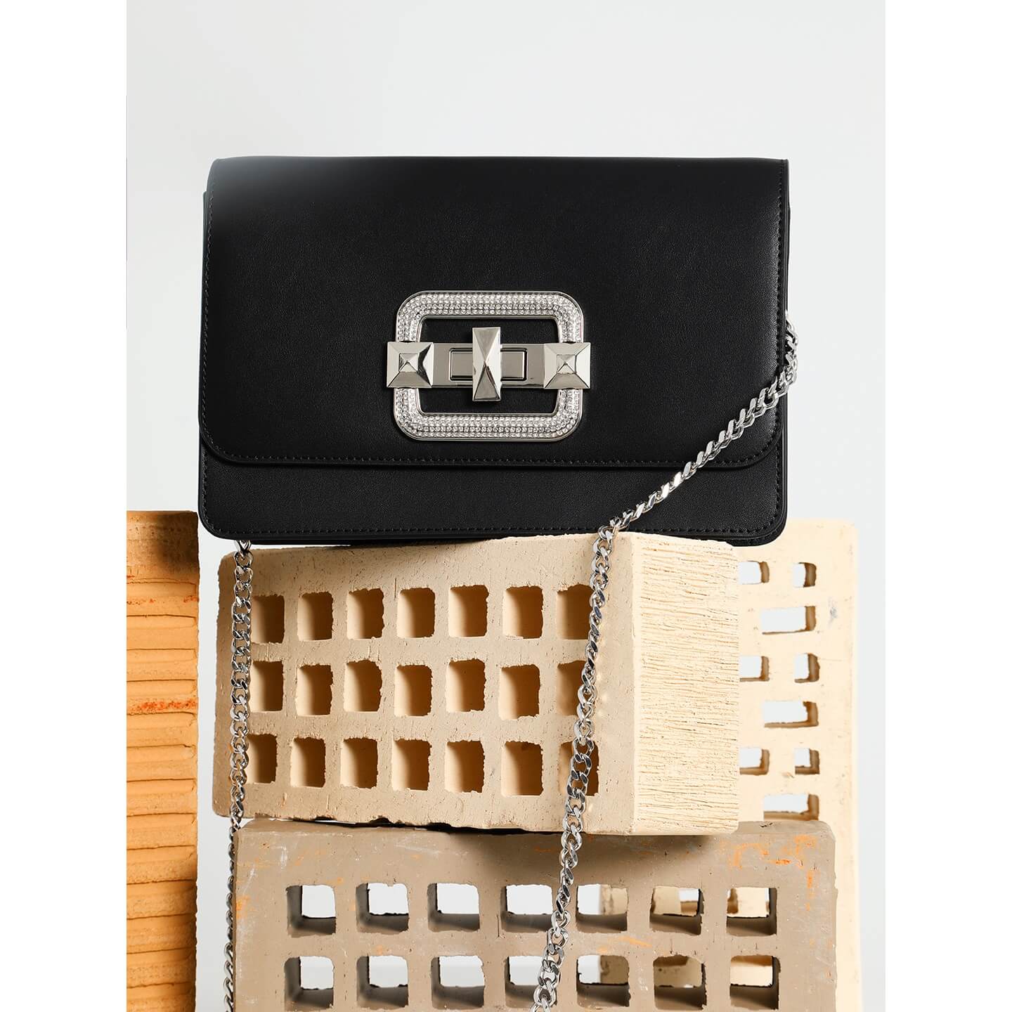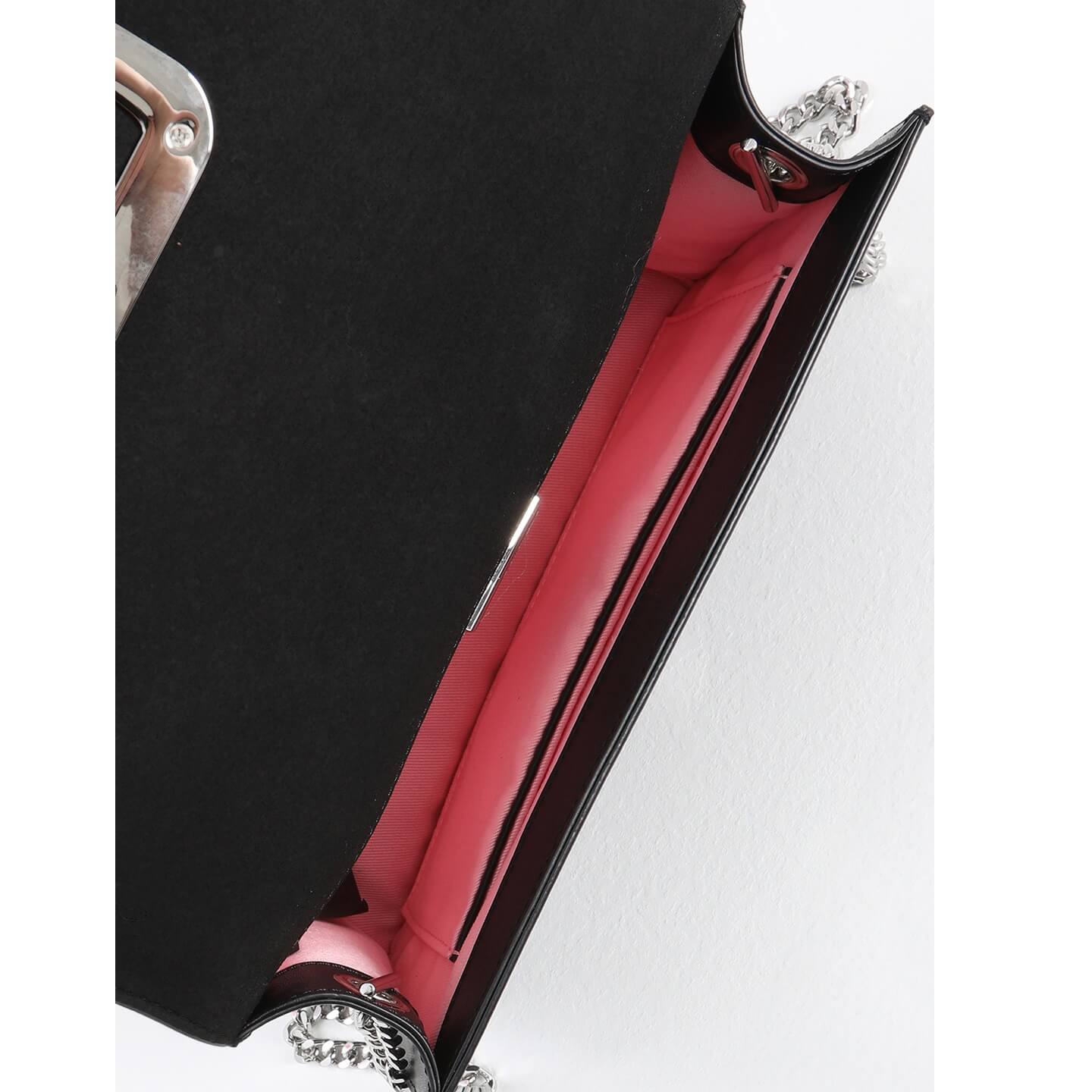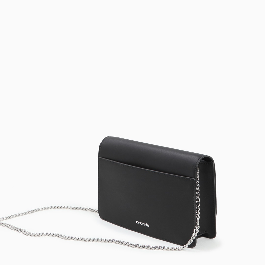 Geanta neagra eleganta, CROMIA, din piele naturala, cu un compartiment inchis cu capac si accesoriu rotativ, buzunare interioare, curea de umar din lant, accesorii aregintii.