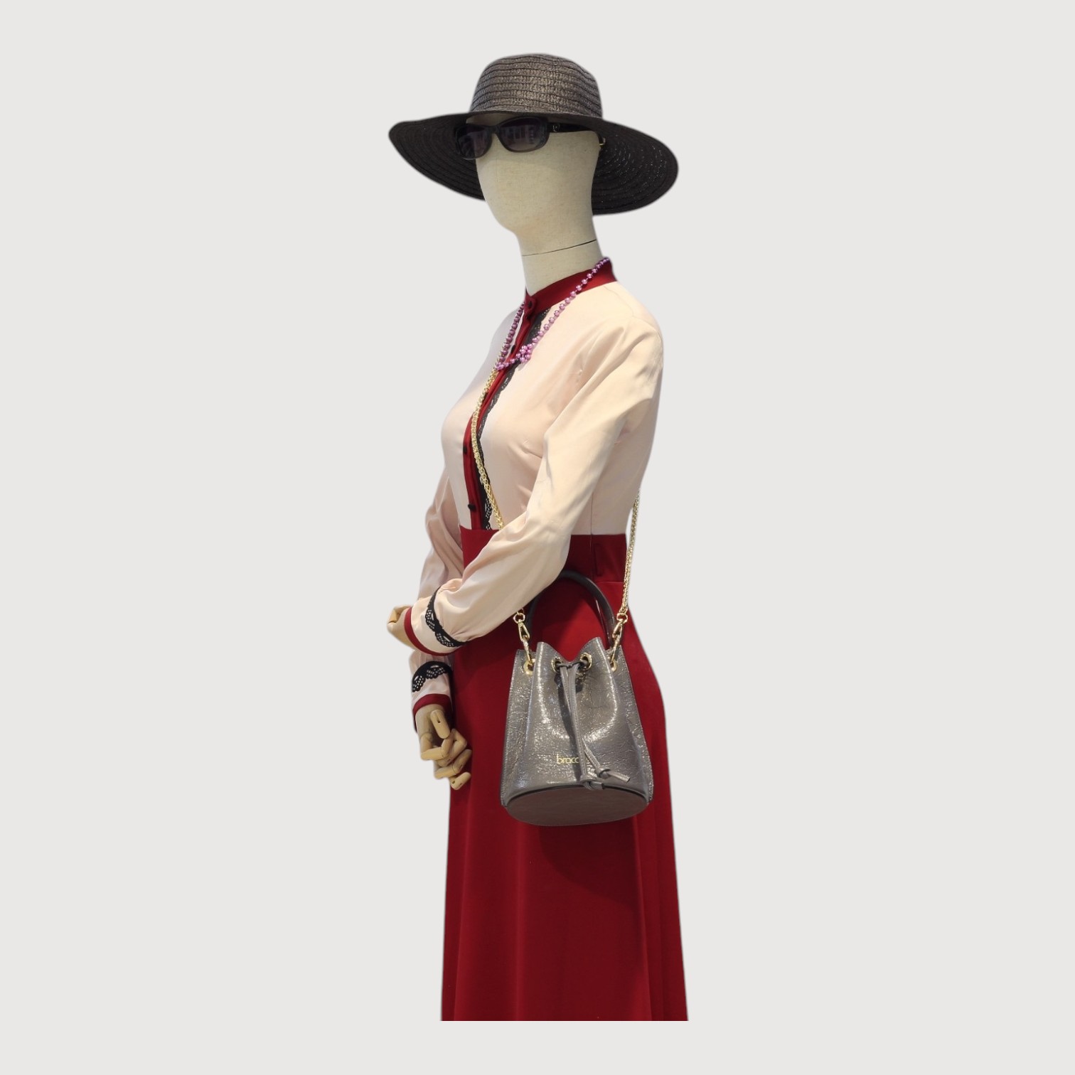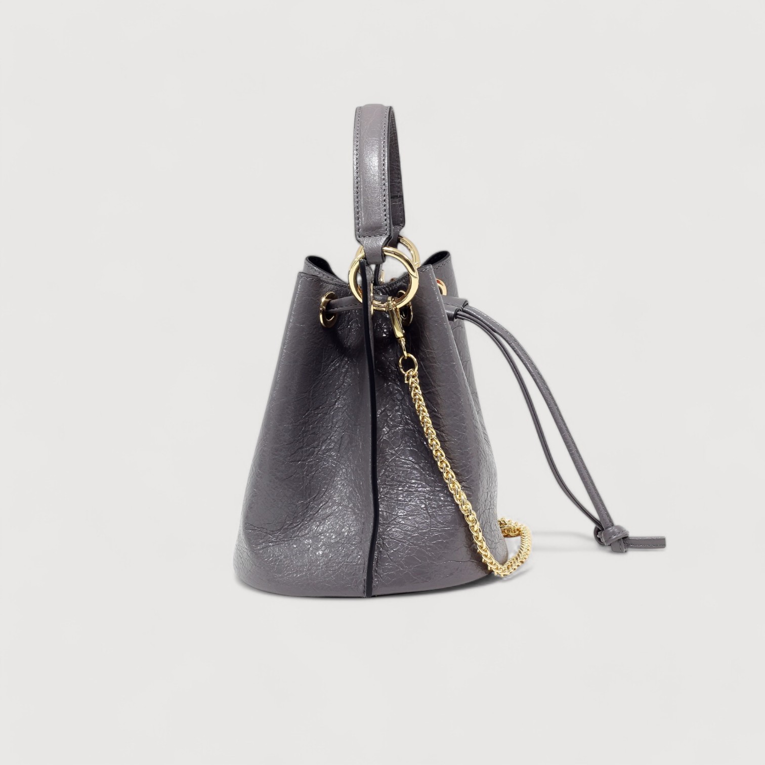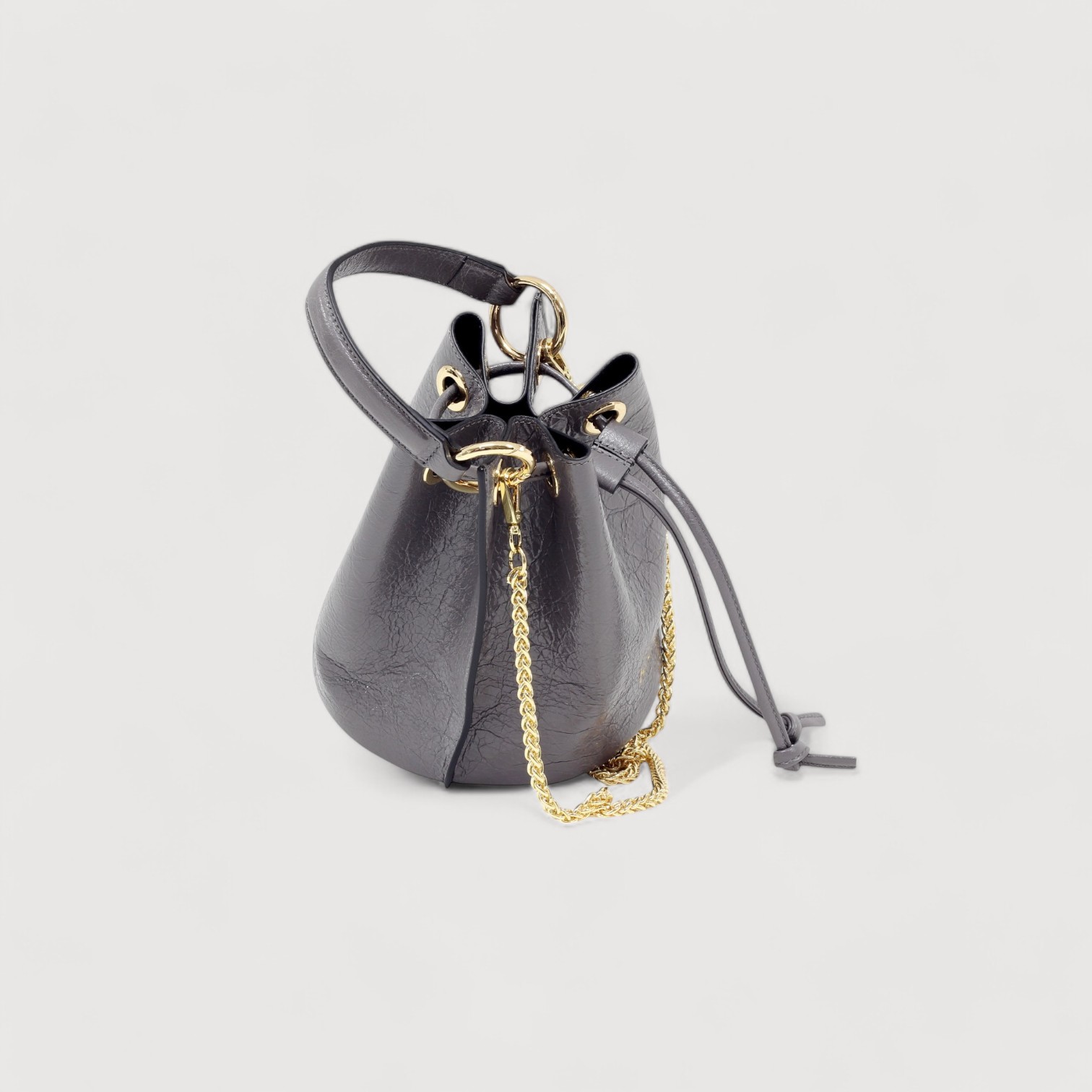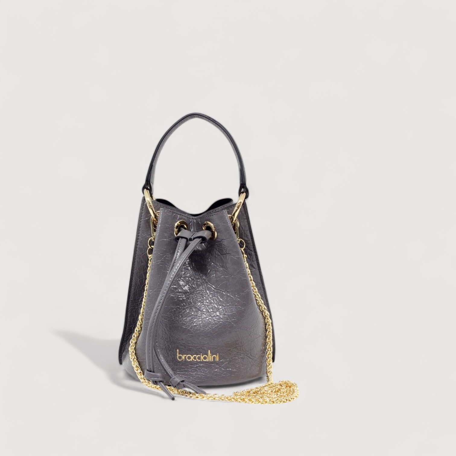 Geanta tip sac BRACCIALINI din piele naturala vachetta, cu un compartiment inchis cu un snur din piele, maner de mana, detasabil, curea de umar, din lant auriu, detasabil, accesorii aurii. Made in Italy