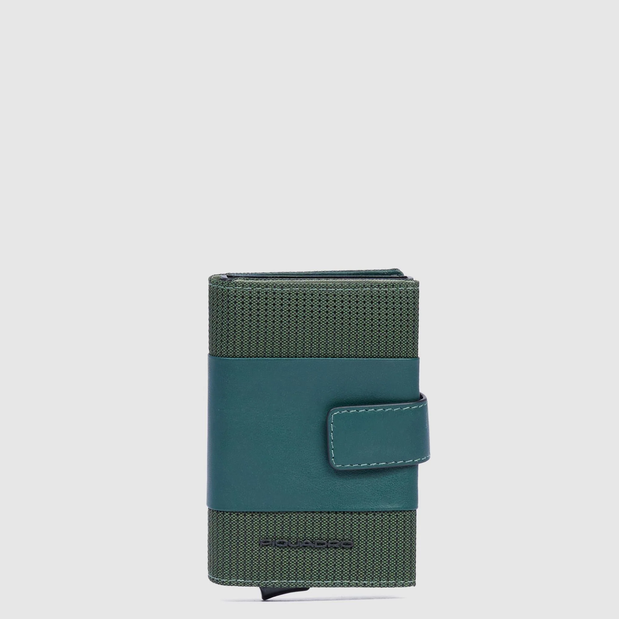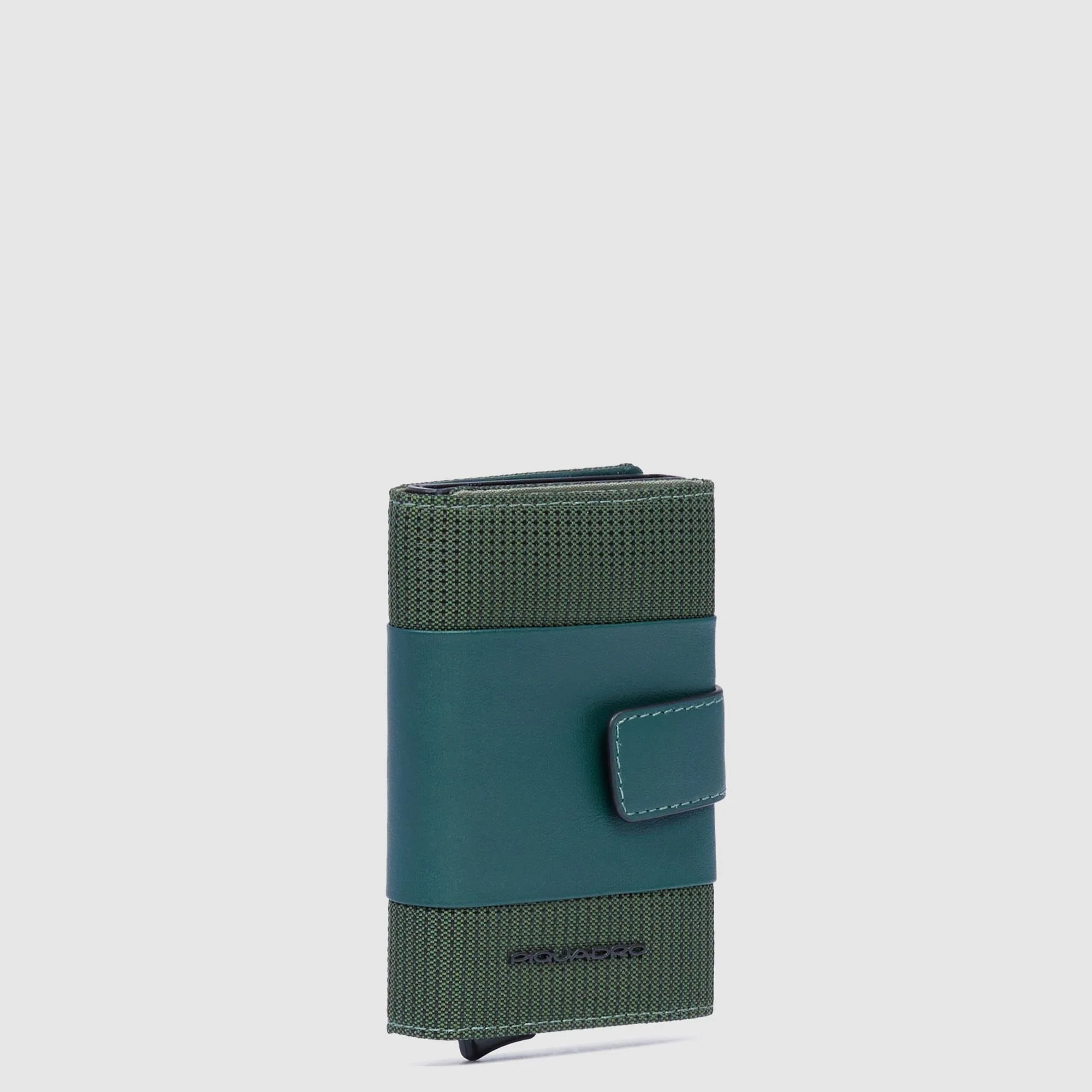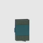 Husa suport PIQUADRO pentru 5 / 7 carduri, din metal si piele, compartiment pentru bancnote, inchidere cu capsa, sistem de culisare pentru carduri, sistem RFID.