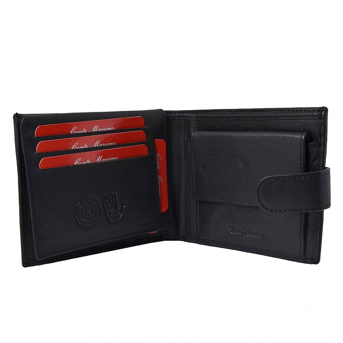 Portofel de barbati CONTE MASSIMO din piele naturala, cu doua compartimente pentru bancnote, plus unul cu fermoar, 9 suporturi de card, portdocument, portmoned, multiple alte buzunare, sistem RFID, cutie personalizata, intra CI romanesc.