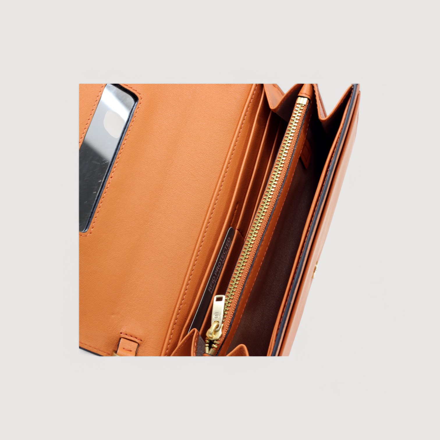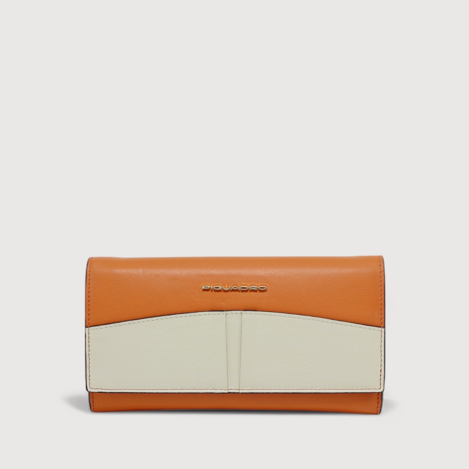 Portofel de dama PIQUADRO din piele naturala, cu doua compartimente pentru bancnote separate de un buzunar cu fermoar in care se poate introduce si un telefon, 12 suporturi de card, oglinda pe capacul interior, buzunar exterior, curea de umar, din lant, detasabil, greutate 300gr.