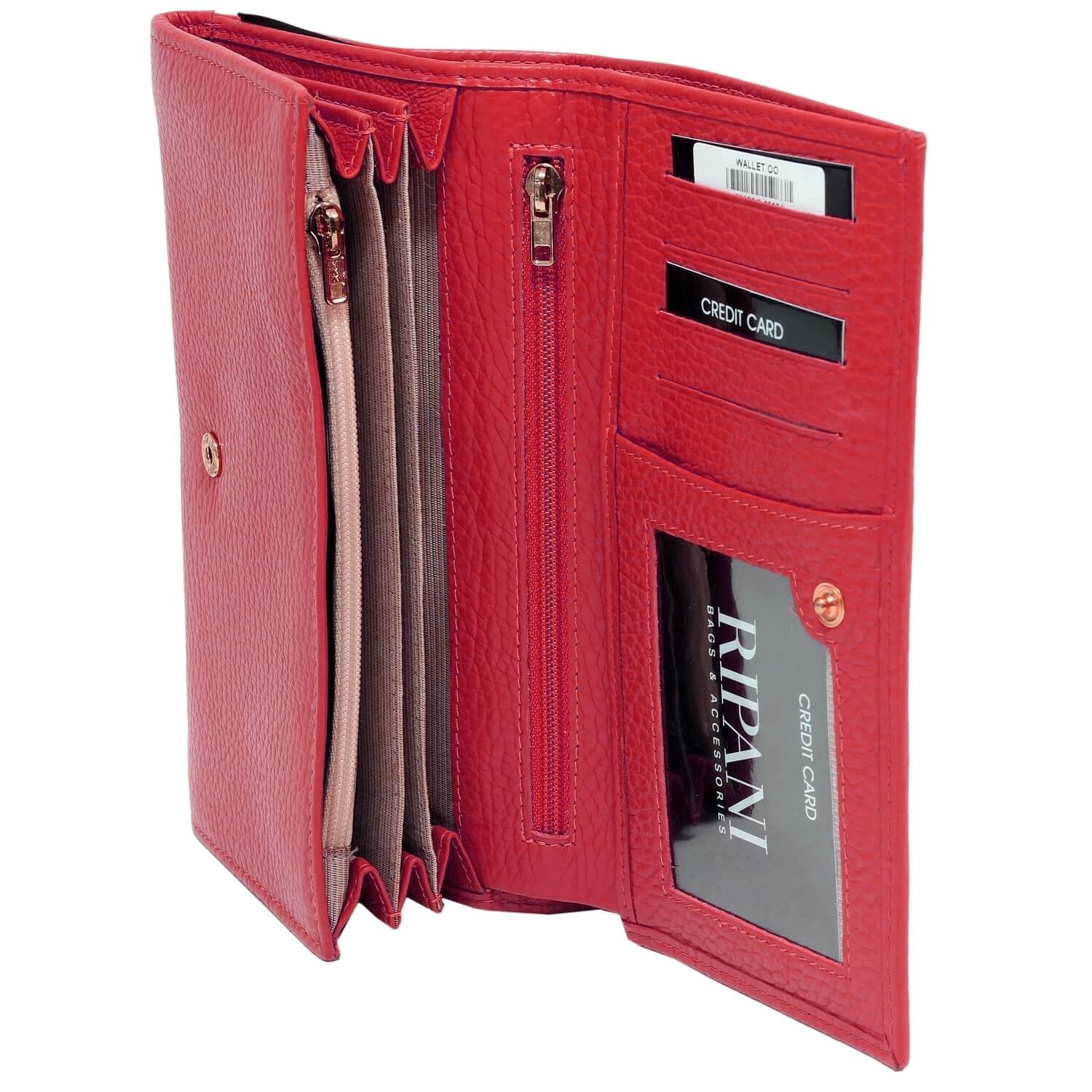Portofel de dama Ripani din piele naturala, inchis cu capsa, cu un compartiment vertical, mare, pentru bancnote plus alte trei (orizontale), 4 portcarduri, buzunar pentru monede inchis cu fermoar, alte buzunare diverse. Made in Italy