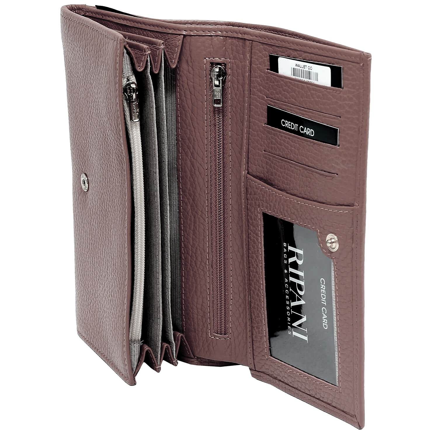 Portofel de dama Ripani din piele naturala, inchis cu capsa, cu un compartiment vertical, mare, pentru bancnote plus alte trei (orizontale), 4 portcarduri, buzunar pentru monede inchis cu fermoar, alte buzunare diverse. Made in Italy
