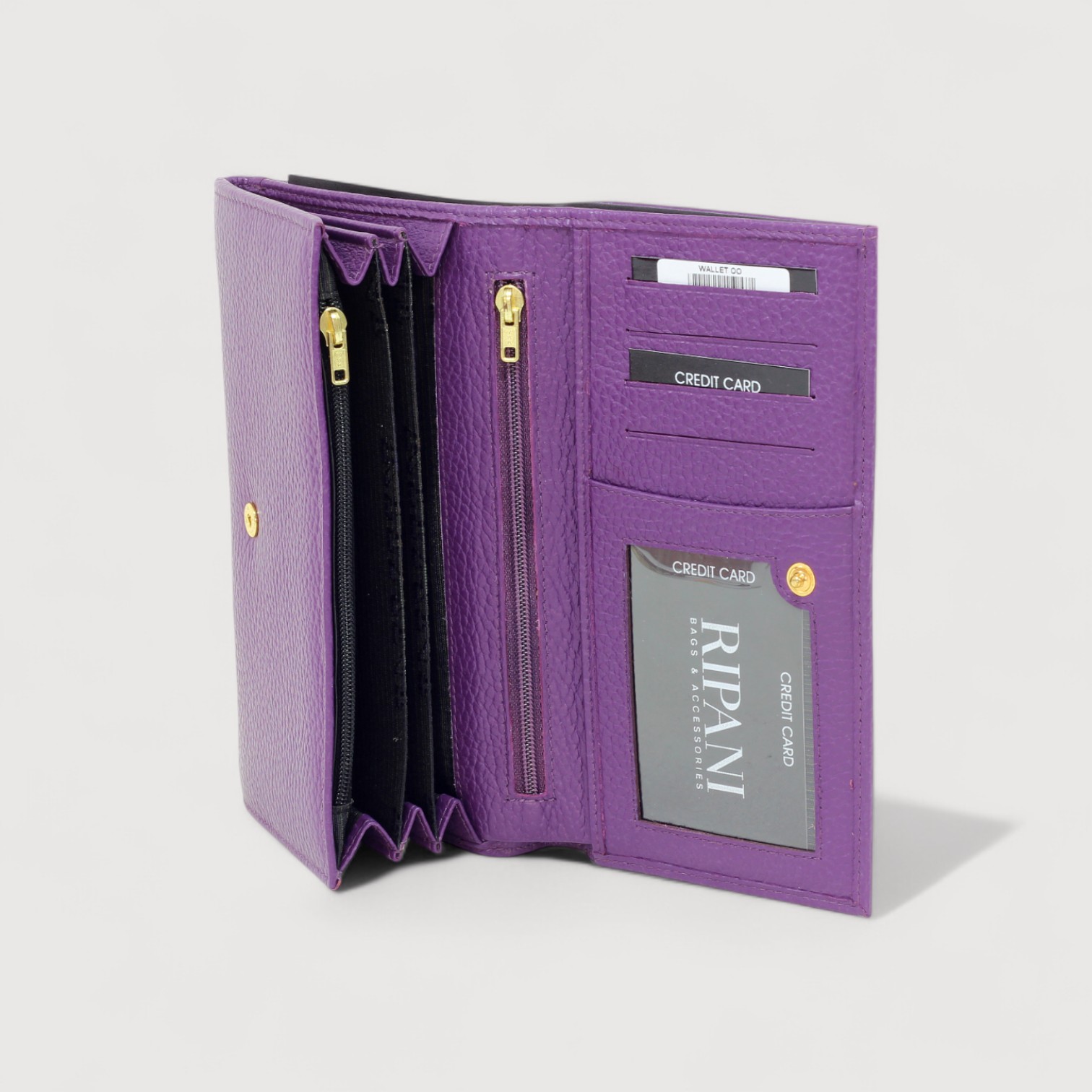 Portofel de dama Ripani din piele naturala, inchis cu capsa, cu un compartiment vertical pentru bancnote, trei compartimente orizontale, 4 portcarduri, 2 buzunare inchise cu fermoar, alte buzunare diverse. Made in Italy