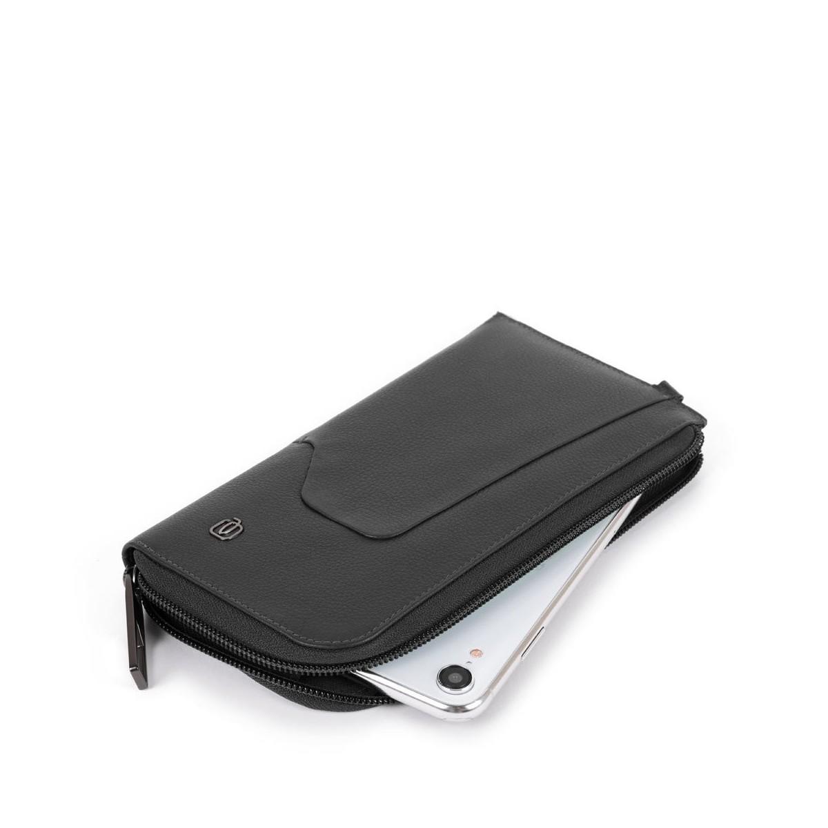 Portofel slim PIQUADRO port smartphone, din piele naturala, cu un compartiment inchis cu fermoar, compartiment pentru celular, suporturi pentru carti de credit, sistem protectie RFID, curea de mana detasabila.