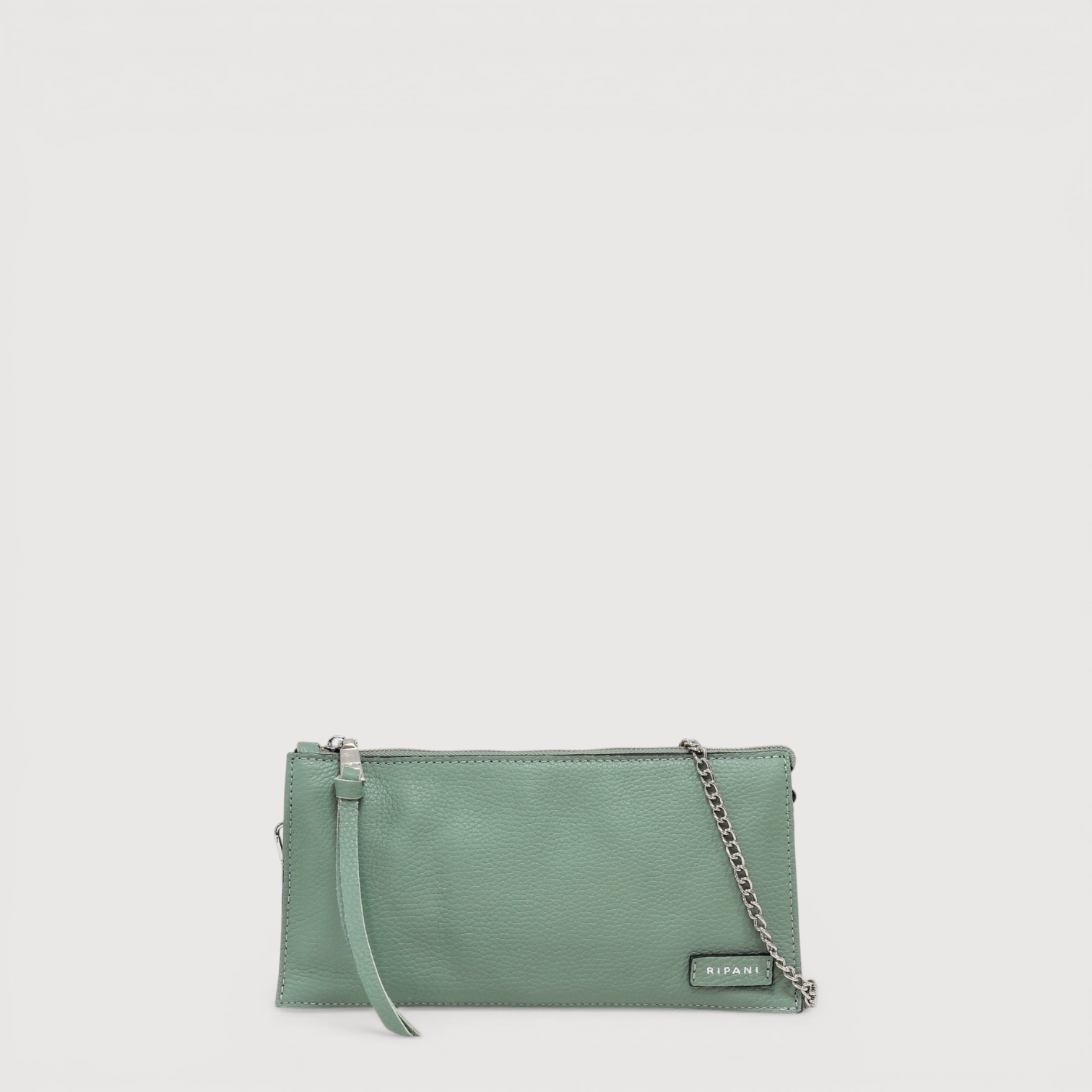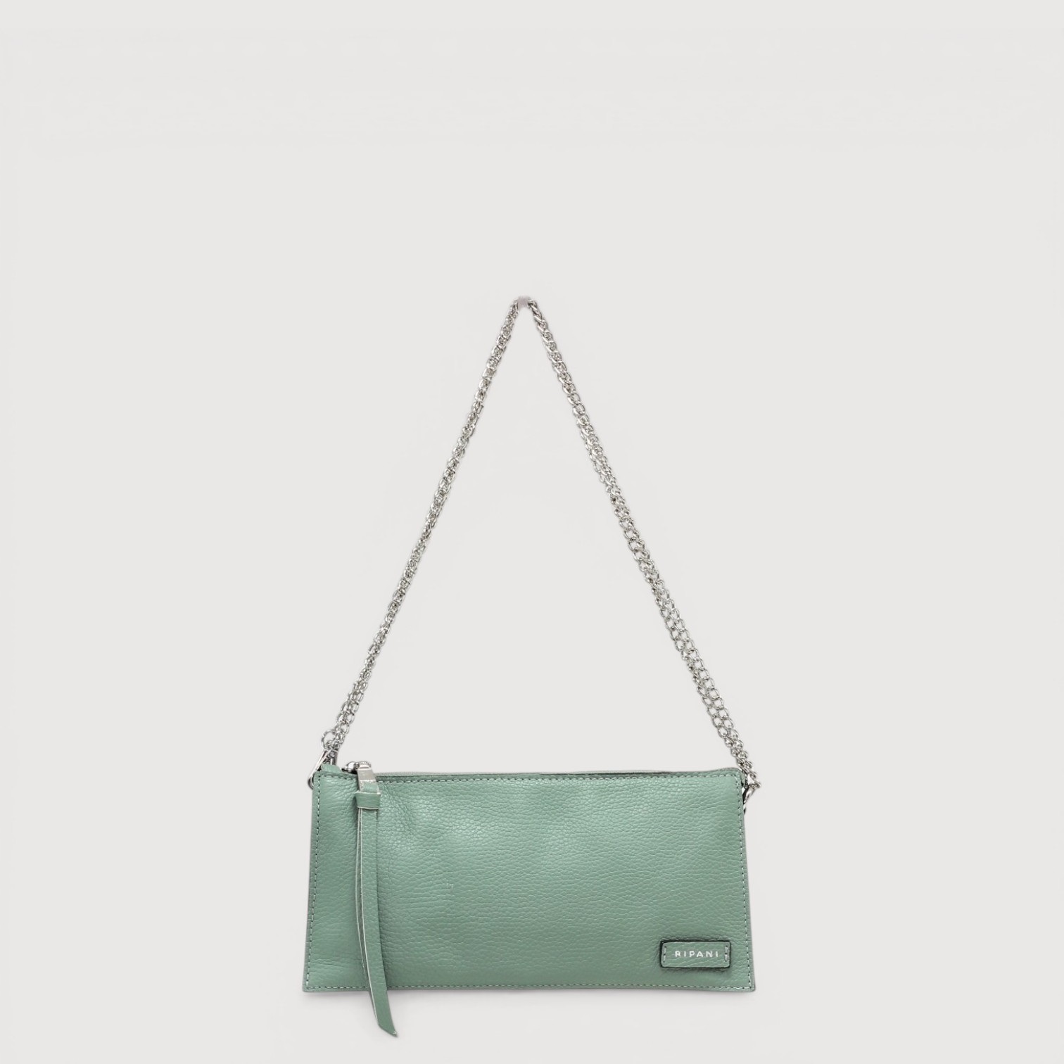 Poseta eleganta RIPANI din piele naturala, la interior are trei compartimente, buzunar cu fermoar, doua suporturi de card, inchidere cu fermoar, curea din lant, dublu reglabil ( se poate purta pe umar cat si crossbody). Made in Italy