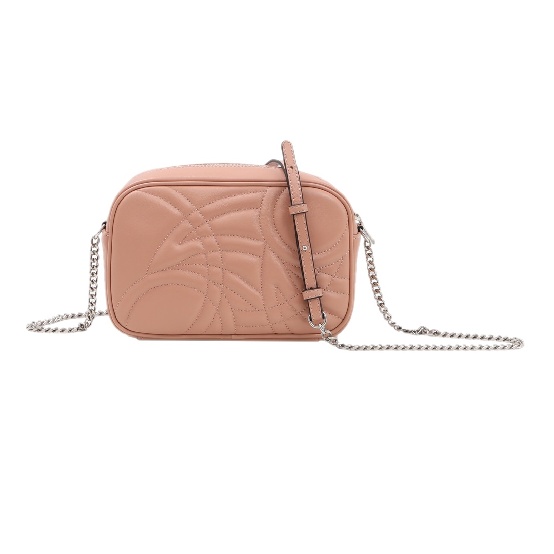 Poseta de umar CROMIA, din piele naturala matlasata, cu un compartiment inchis cu fermoar, buzunare interioare multifunctionale, buzunar exterior inchis cu un accesoriu rotativ, curea lunga de umar, din lant si piele, accesorii argintii.