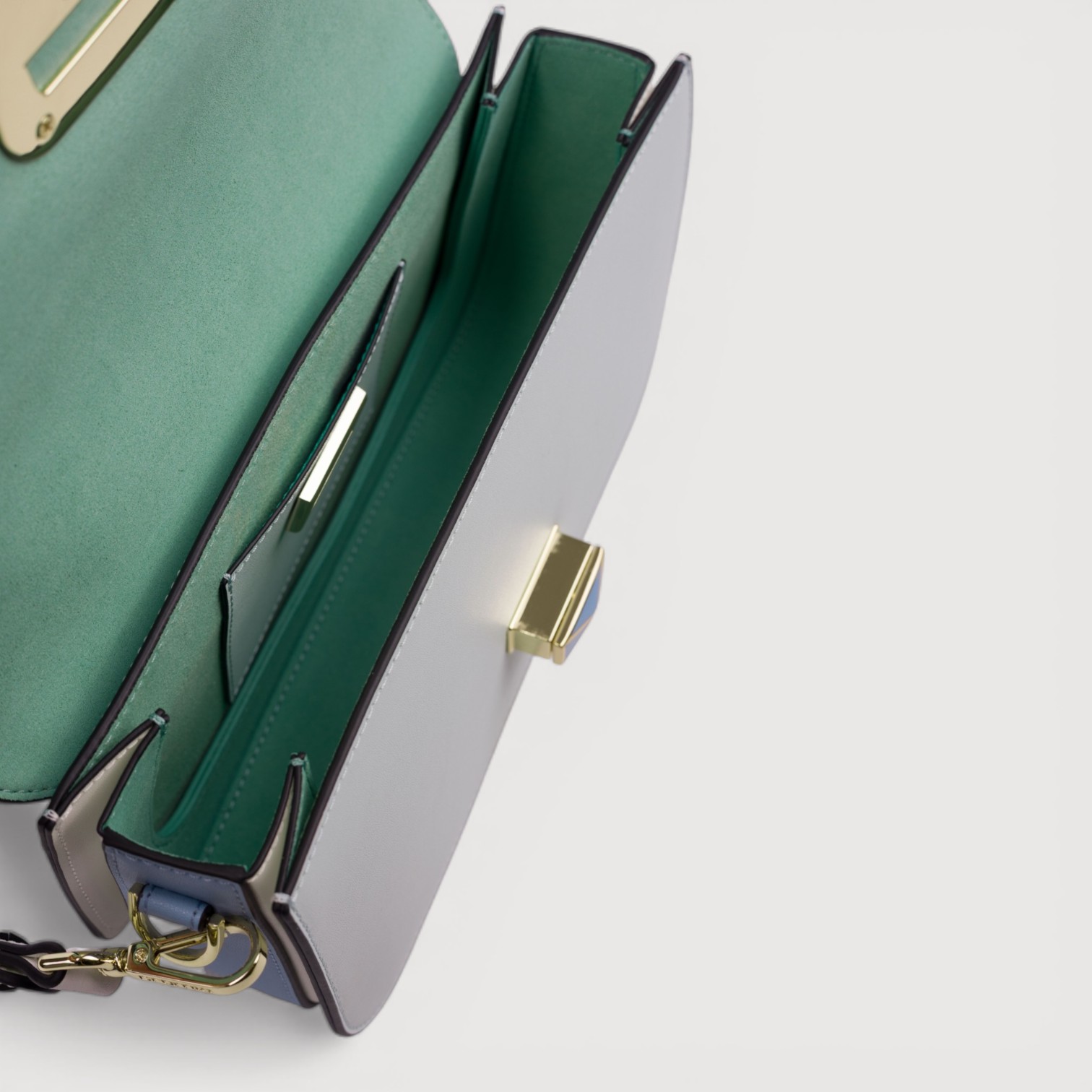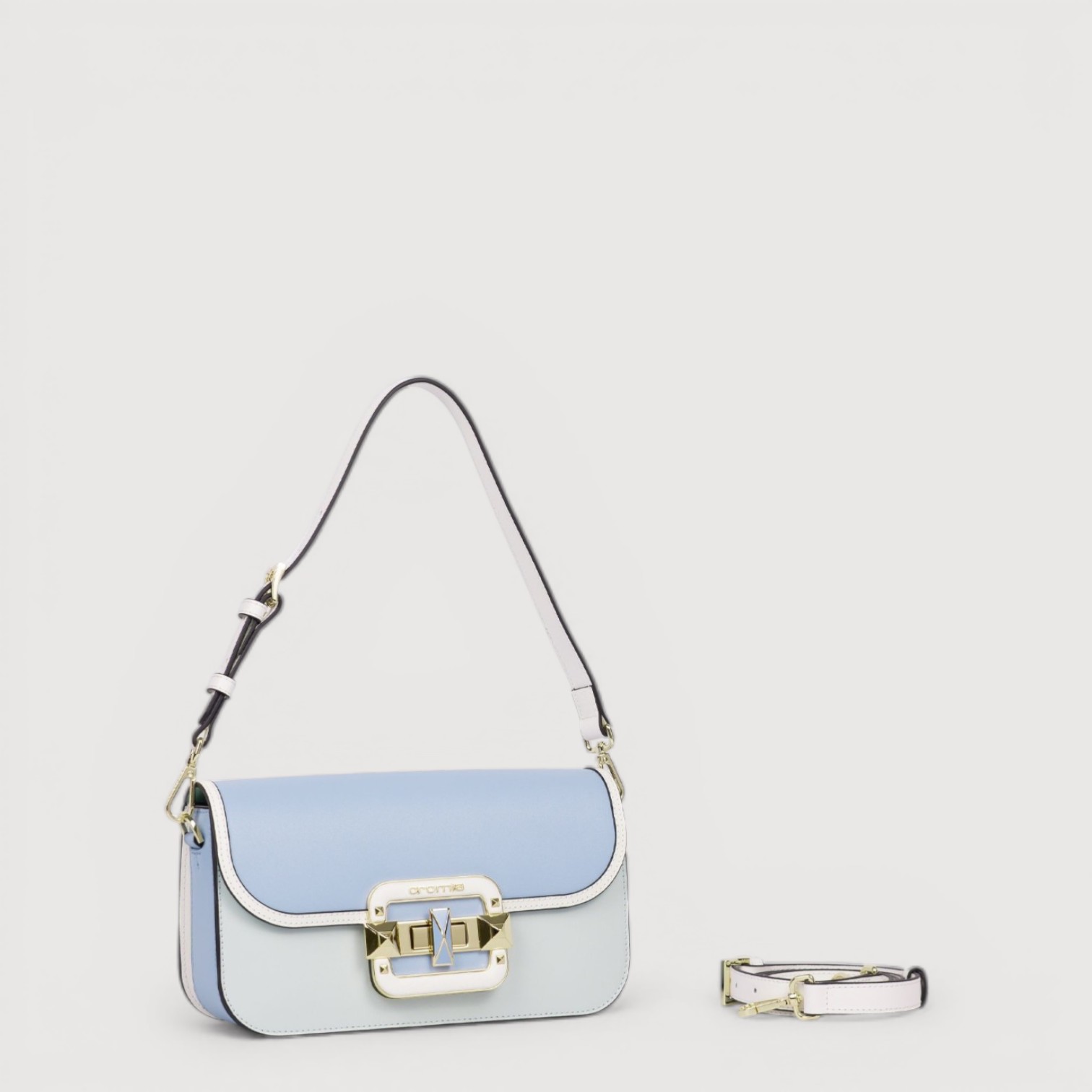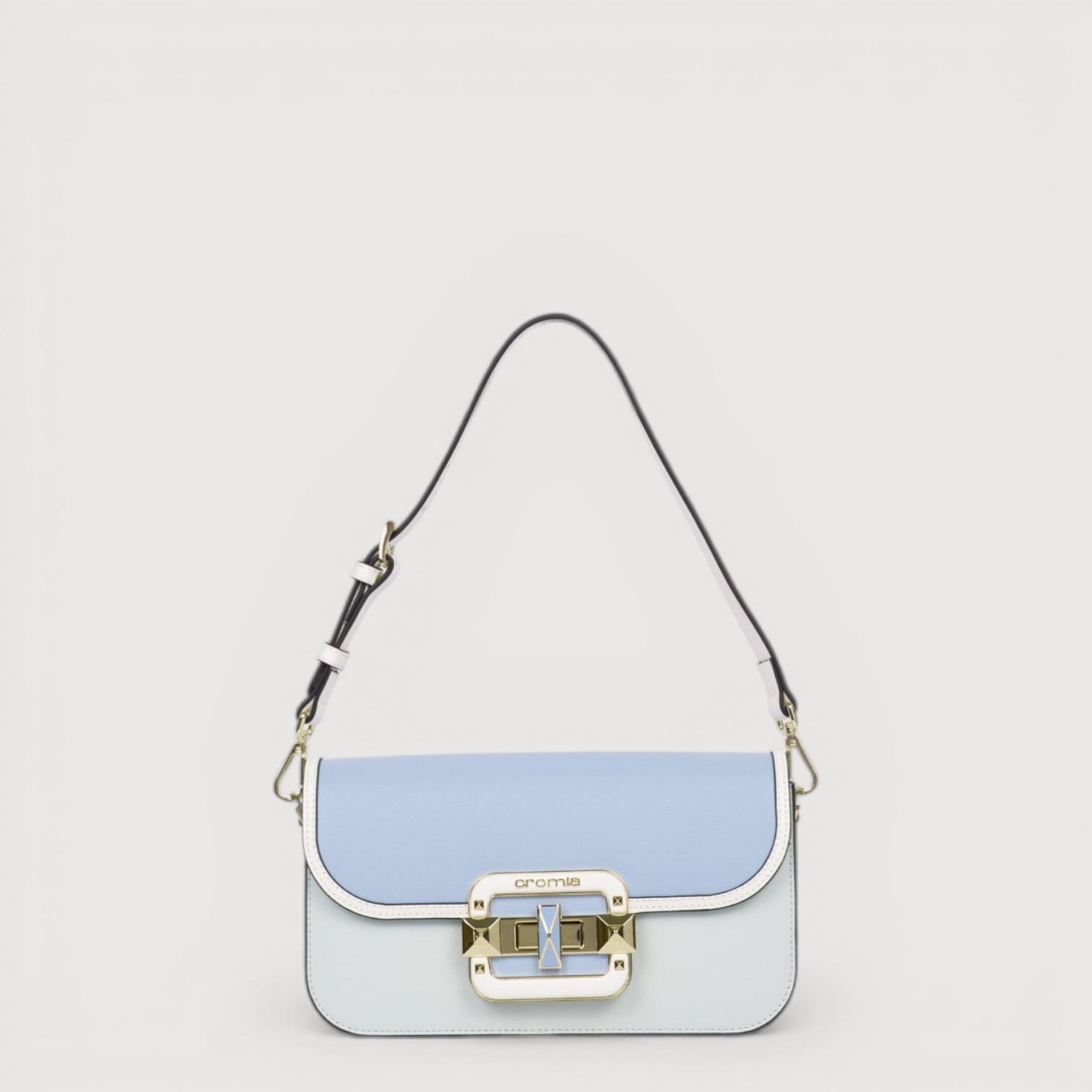 Poseta eleganta CROMIA din piele naturala, cu un compartiment inchis cu capac si accesoriu rotativ, buzunare interioare si unul exterior, curea scurta de umar, curea lunga, din piele, reglabila si detasabila, accesorii aurii. Made in Italy