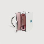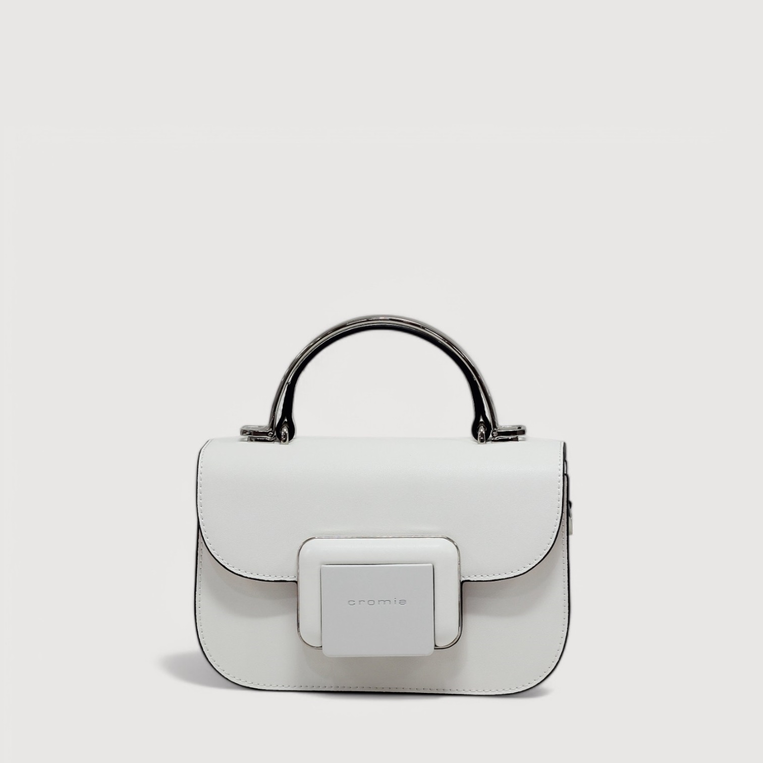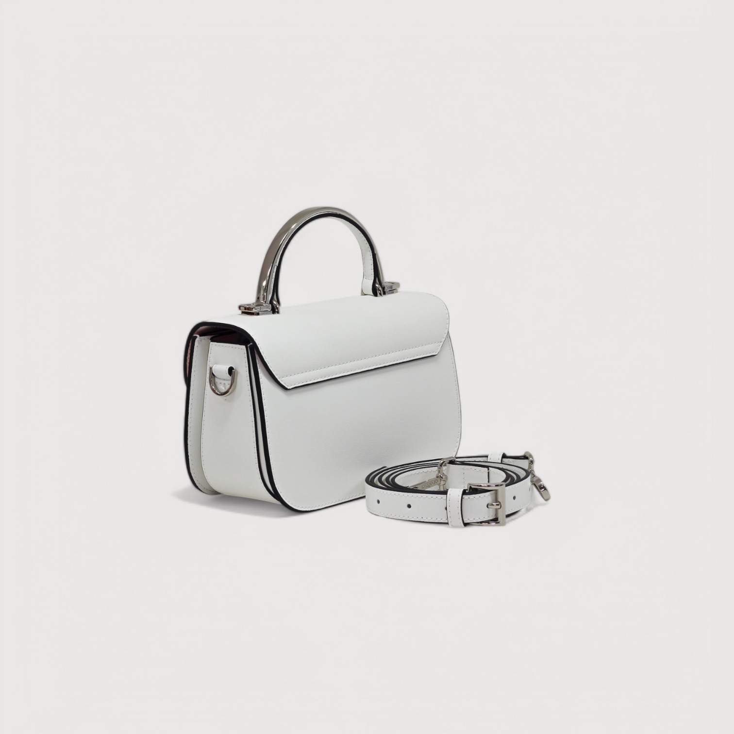 Poseta mica CROMIA din piele naturala, cu un compartiment inchis cu capac cu accesoriu metalic, buzunare interioare, maner de mana din metal si piele, curea de umar, din piele, reglabila si detasabila, accesorii argintii. Made in Italy