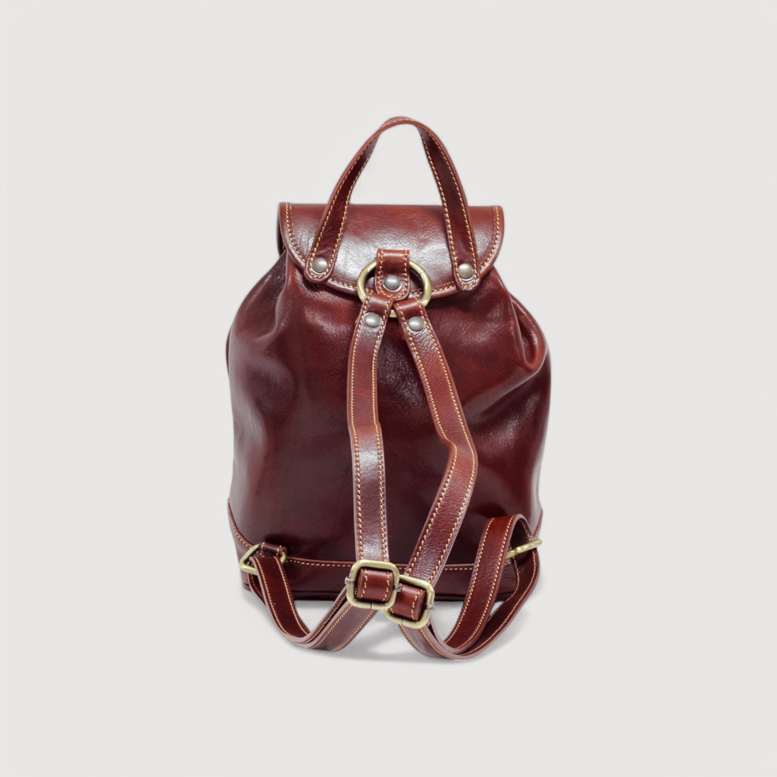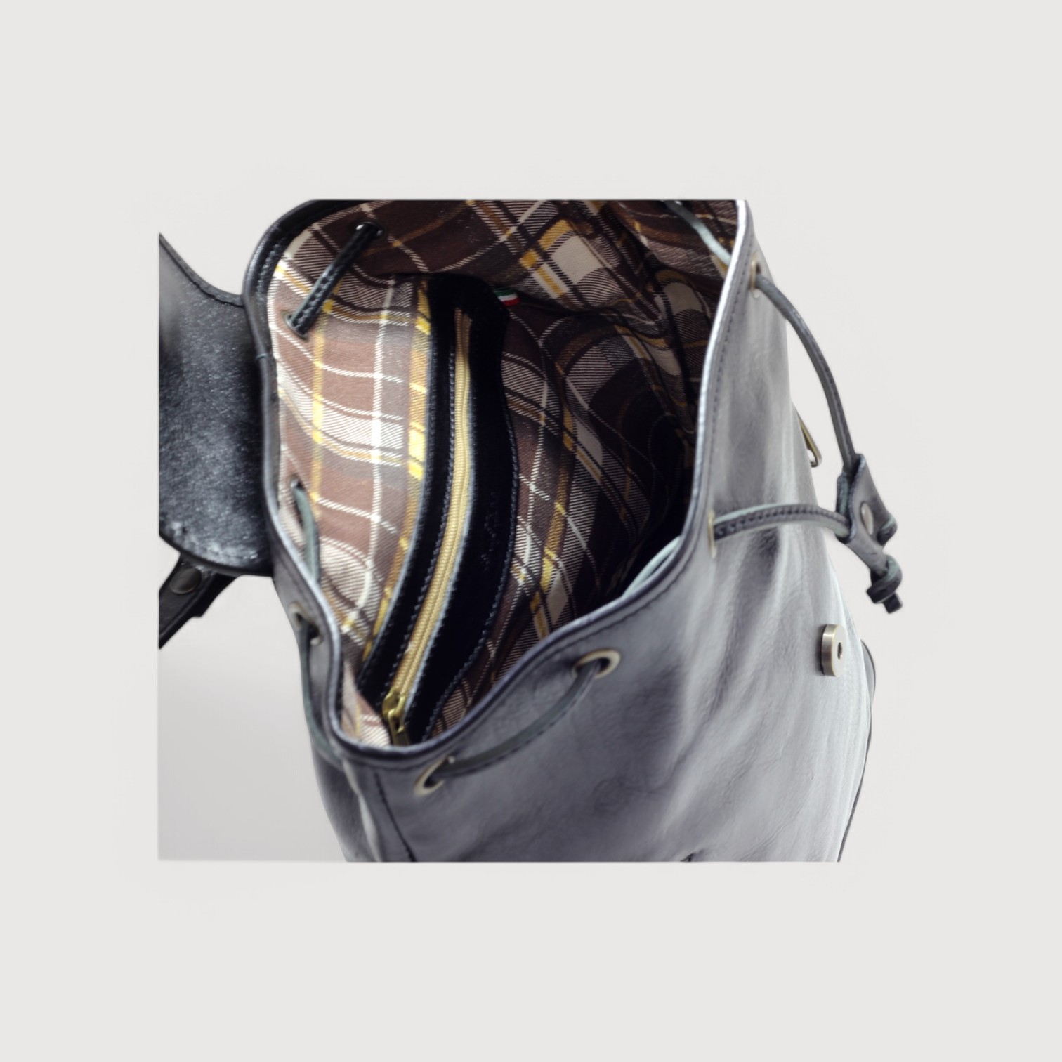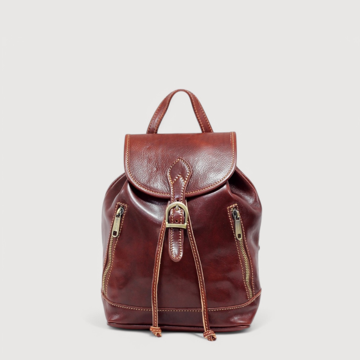 Rucsac de dama, din piele naturala vachetta, cu un compartiment inchis cu snur din piele si capac cu buton magnetic, buzunar interior si doua exterioare, captuseala din bumbac, curele de umar, reglabile, greutate 0,7kg. MADE IN ITALY