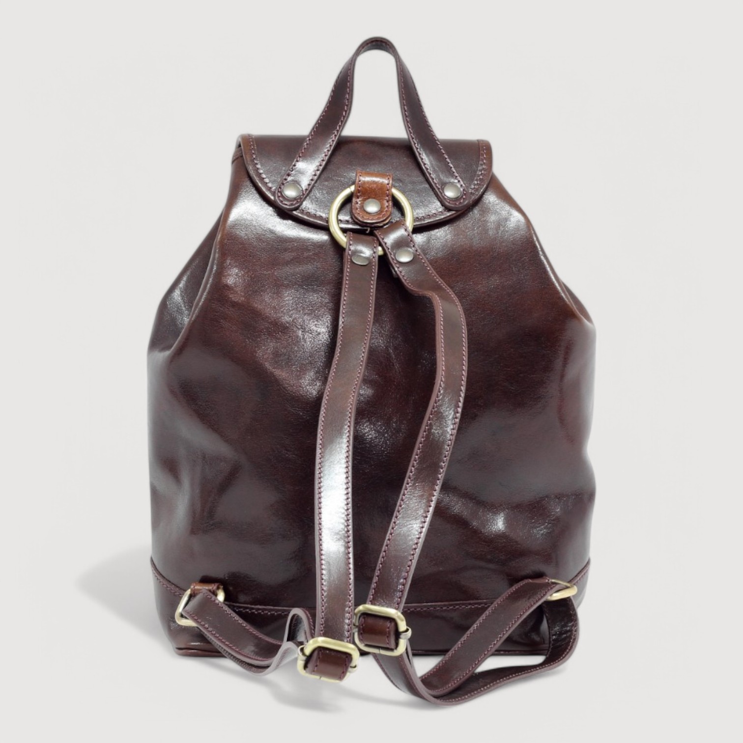Rucsac din piele naturala vachetta, cu un compartiment inchis cu snur din piele si capac cu buton magnetic, un buzunar interior si doua exterioare, captuseala din bumbac, curele de umar, reglabile, greutate 0,9kg. MADE IN ITALY