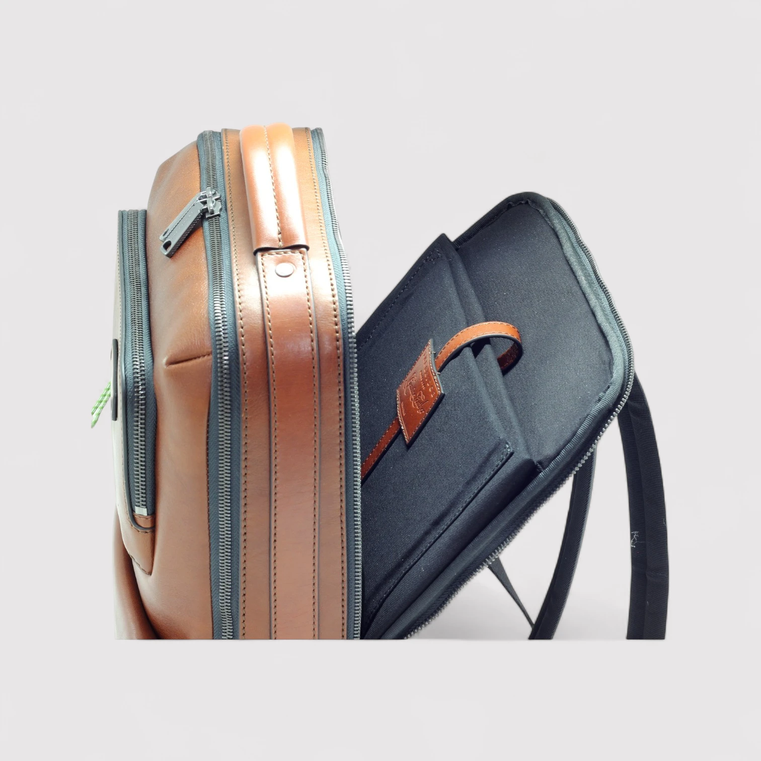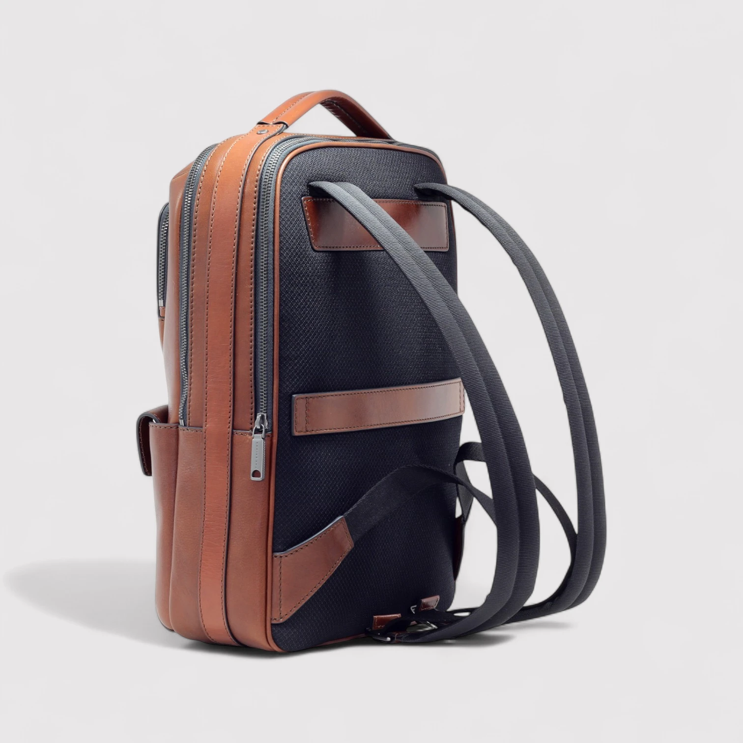 Rucsac THE BRIDGE din piele naturala, cu doua compartimente inchise cu fermoar, in cel din spate se gasesc buzunare cu protectie pentru un laptop de 14” si o tableta, alte buzunare multifuntionale, la exterior are doua buzunare frontale, pe spate are sistem de ventilatie, curele de umar,ergonomice si reglabile. Made in Italy