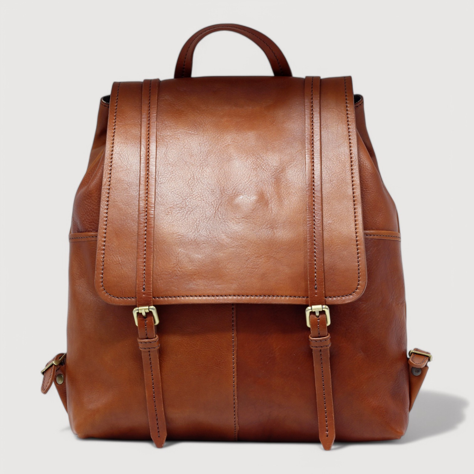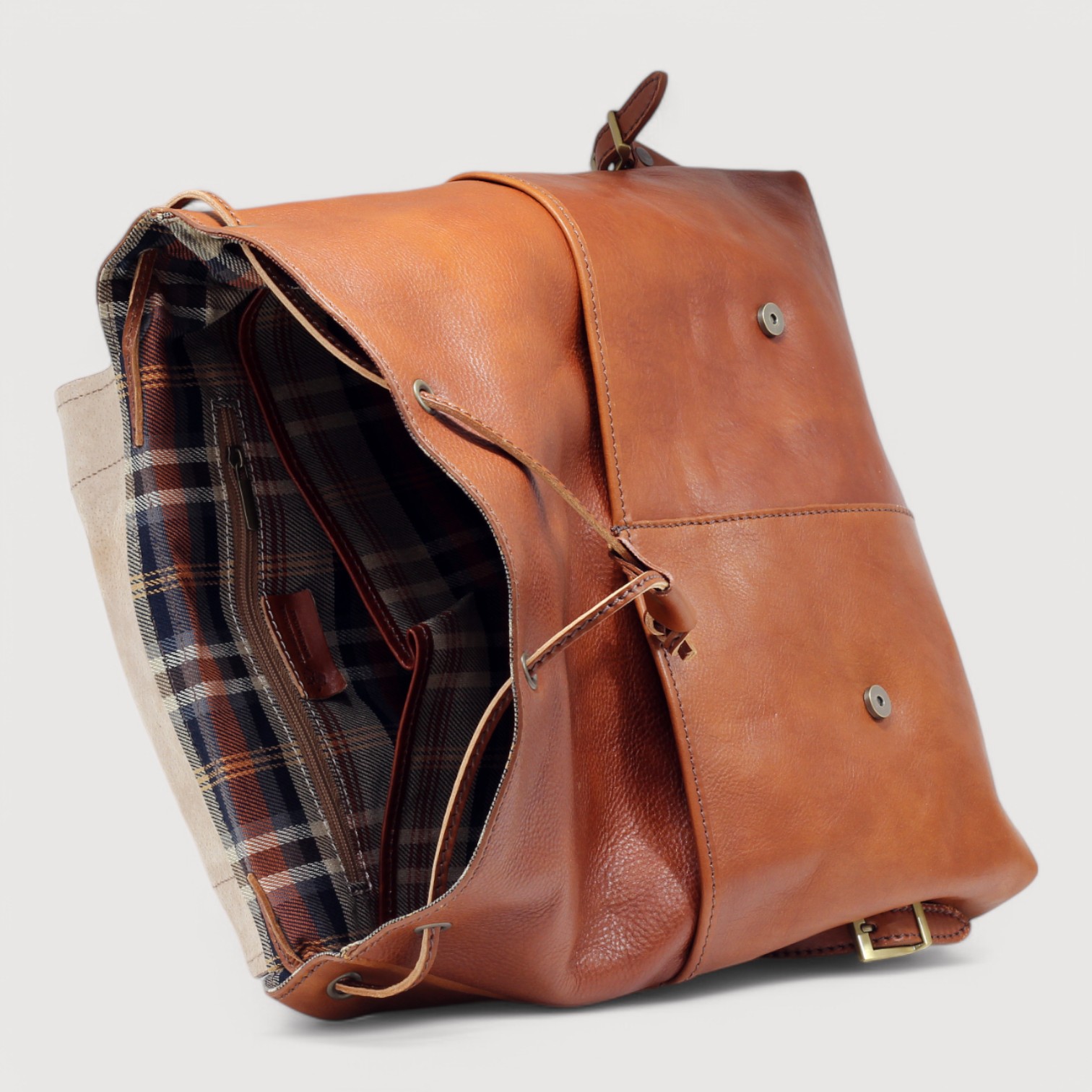 Rucsac din piele naturala vachetta, cu un compartiment inchis cu snir si capac cu butoni magnetici, buzunar interior pentru un laptop, doua buzunare exterioare frontale, curele de umar, reglabile, greutate 0,85kg. Made in Italy
