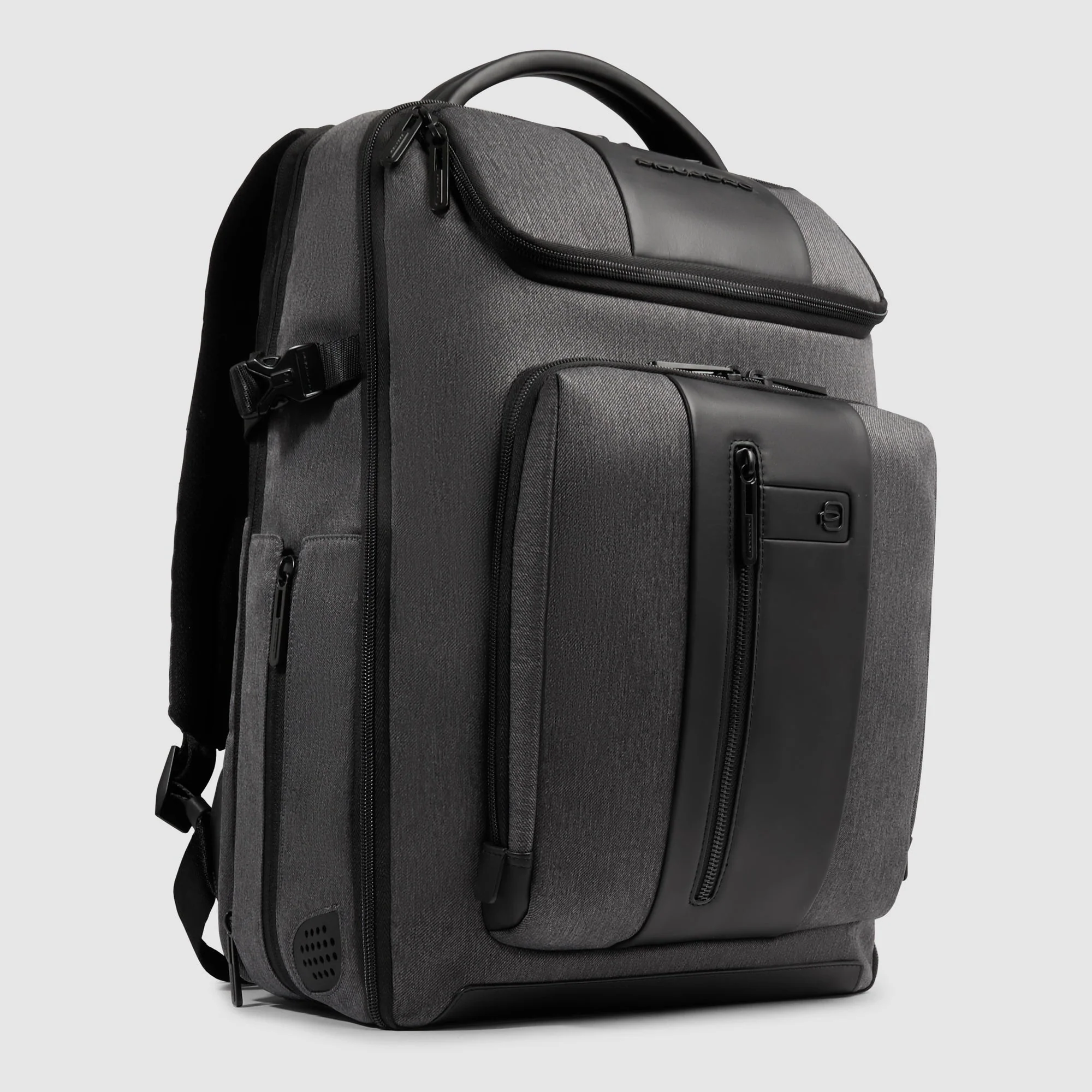 Rucsac extensibil, din material textil și piele reciclată, cu suport pentru ochelari, RFID și protecție pentru absorbția șocurilor, cu doua comparetimente inchise cu fermoar, la interior se gasesc buzunare cu protectie pentru un laptop de 15,6” si iPad® 10,2”Air 10,9”Pro 11”, telefon, baterie, airpods, etc, in buzunarul din fata se gasesc curele de prins hainele, la exterior are doua buzunare frontale, doua pe laterale si unul pe spate, suport de troler, curele de umar, ergonomice si reglabile, sistem de ventilatie pentru spate, doua manere de mana, curele de compresie, volum 1491 gr, greutate 1491gr.