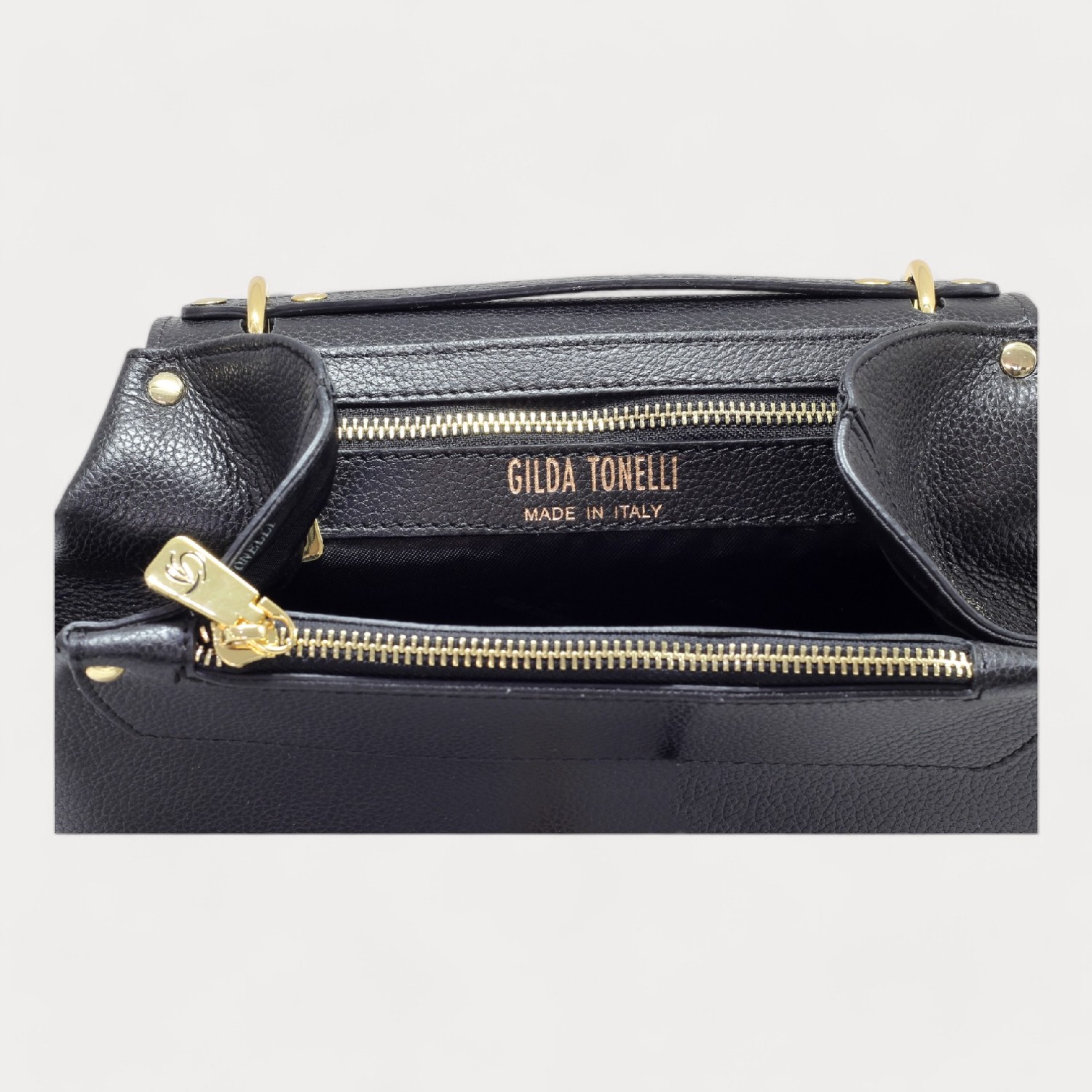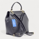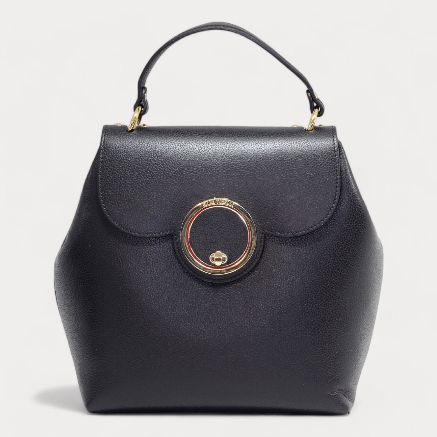 Rucsac / geanta GILDA TONELLI din piele naturala, cu un compartiment inchis cu capac si accesoriu rotativ, doua buzunare cu fermoar, la interior, maner de mana, curele de umar, reglabile si detasabile, accesorii aurii. Made in Italy