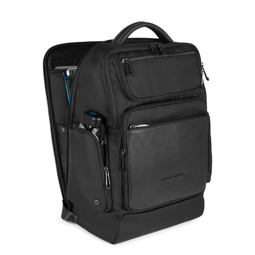 Rucsac PIQUADRO confectionat dintr-un material tesut din care in proportie de 33% este reciclat, cu doua compartimente inchise cu fermoar, la interior are buzunare pentru un laptop de 15,6” / tableta / ipad, cu sistem ,,easy open,, , multiple buzunare, la exterior are 6 buzunare din care unul pentru telefon, detasabil, sistem RFID, suport pentru troler, sistem de ventilatie pentru spate, ce confera un confort maxim, curele de umar ergonomice si reglabile, buzunar pentru un card mai folosit, pe curea, 0,9 kg.