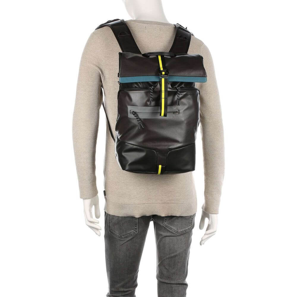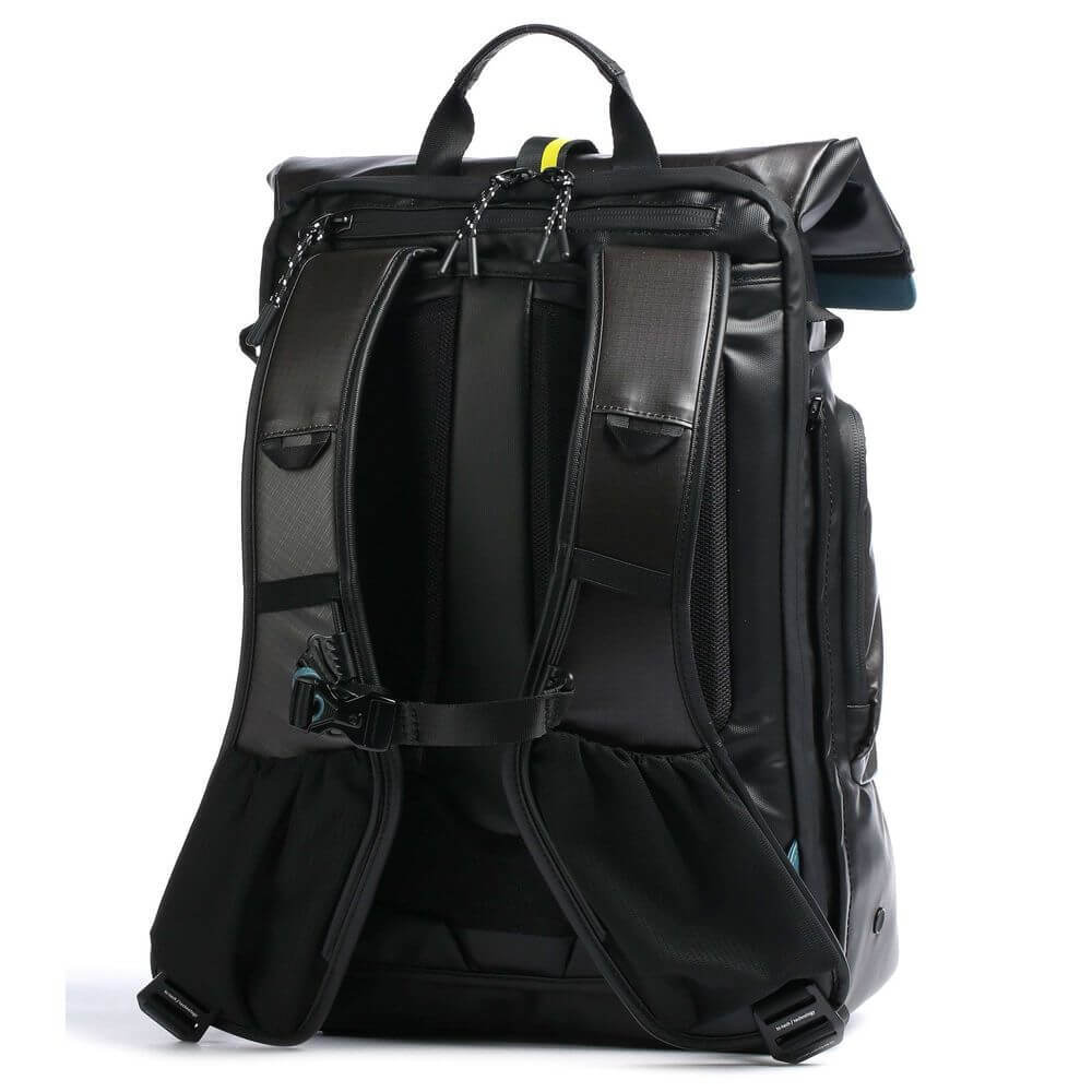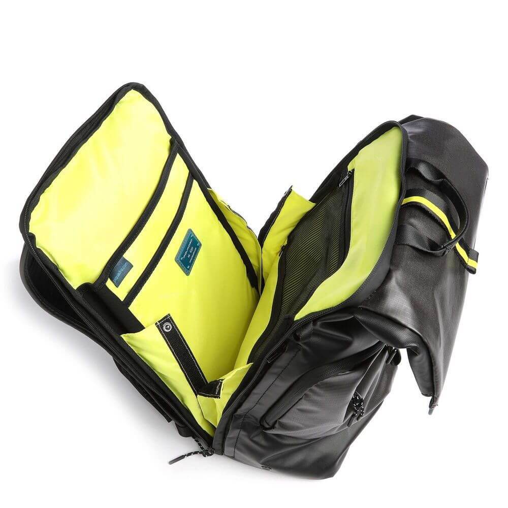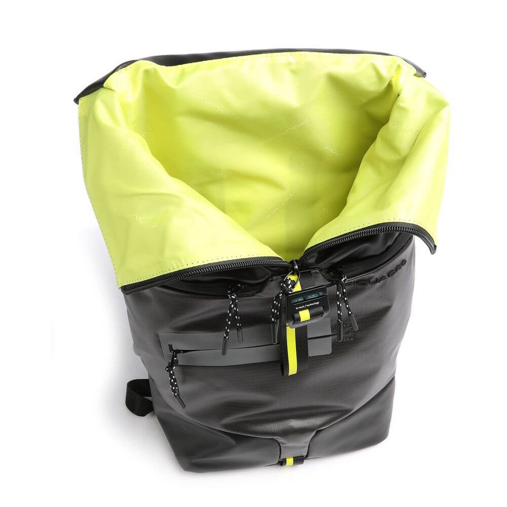 Rucsac Piquadro confectionat dintr-un material special, rezistent, lavabil, cu sistem ,,FAST-CHECK,, , cu doua compartimente, la interior are buzunare speciale (neopren) pentru laptop de 15,6” si Ipad 12,9”, port ochelari, port masti, husa de ploaie, port sticla de apa, umbrela, la exterior are patru buzunare, manere de umar ergonomice si reglabile plus curele de piept, sistem de ventilatie pentru spate, volum 21l, greutate 0,95kg, sistem RFID.