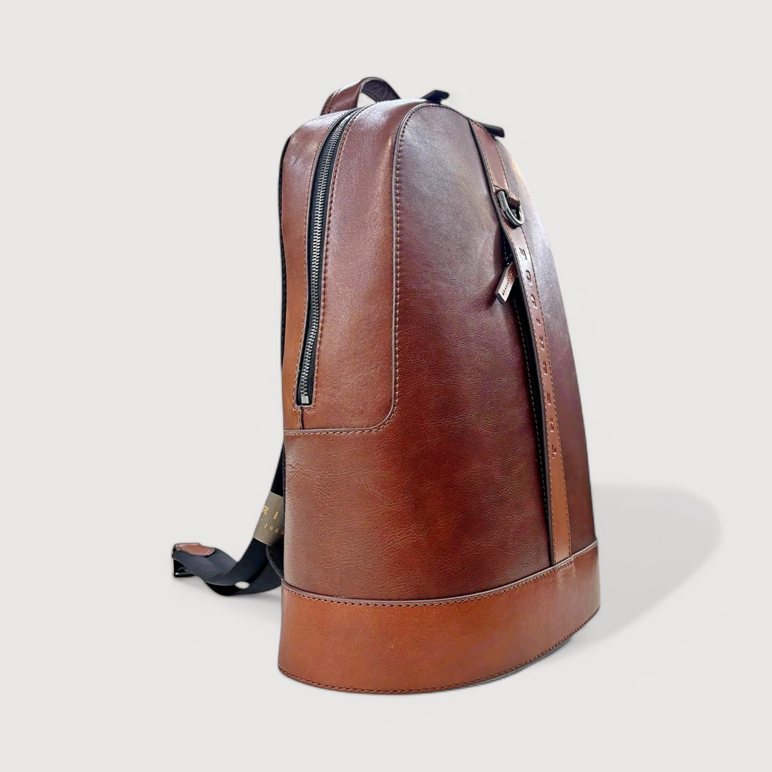Rucsac THE BRIDGE din piele naturala, cu un compartiment inchis cu fermoar, buzunare interioare multifunctionale ( cu protectie pentru un laptop de 13”/ 11” ), buzunar exterior, suport troler, sistem de ventilatie pentru spate, curele de umar, reglabile. Made in Italy
