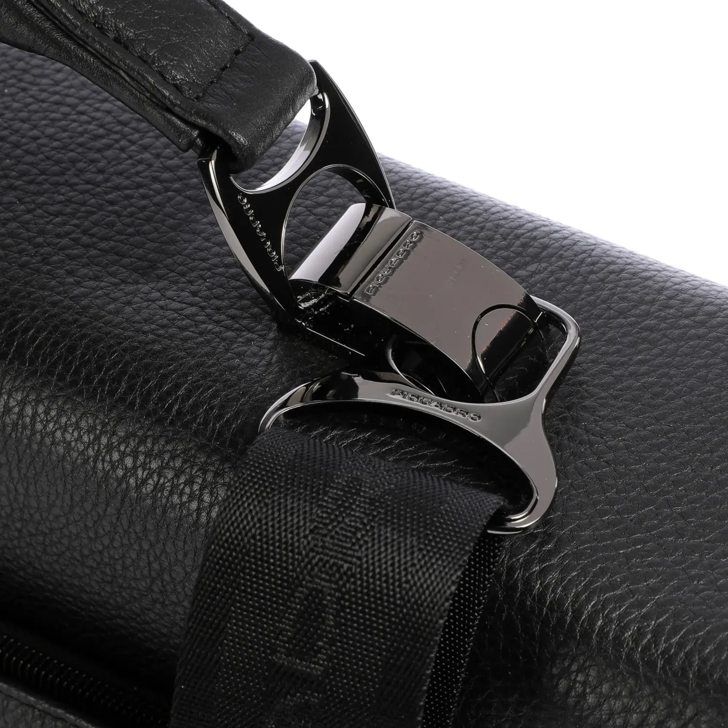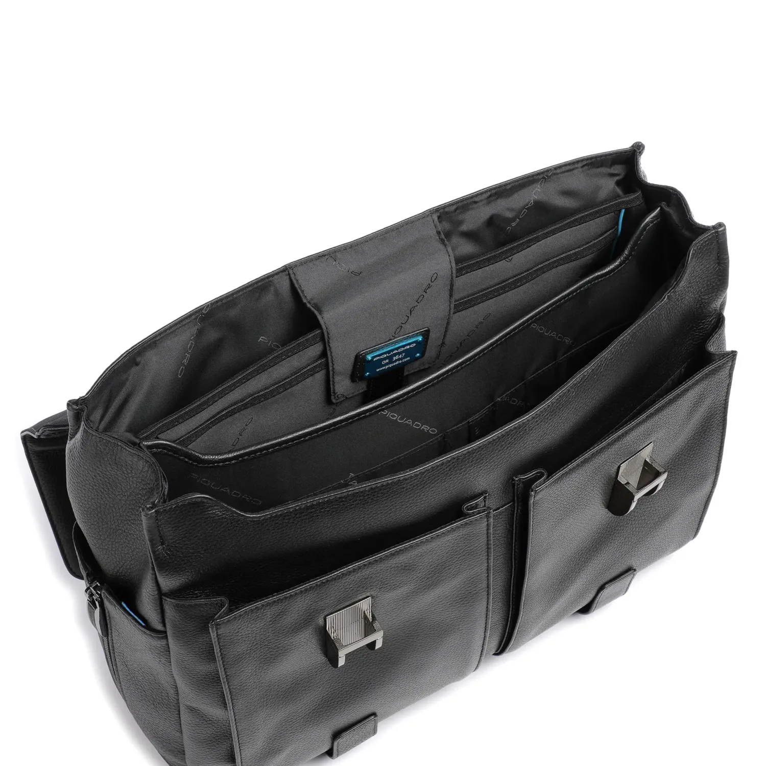 Servieta business PIQUADRO din piele naturala, cu doua compartimente mari pentru documentae, buzunare speciale (neopren) pentru un laptop de 15,6” si iPad Pro® 12.9, pentru telefon , pixuri, etc, doua buzunare frontale exterioare, doua buzunare laterale (pentru sticla de apa/umbrela), suport pentru troler, suport pentru ziare, port adress, posibilitatea de a fi purtata si ca rucsac prin trecerea curelei prin inelul de la baza, greutate 1,8kg, volum 18,5L.