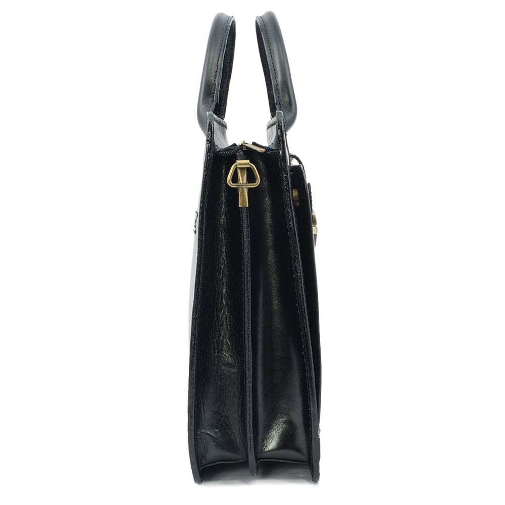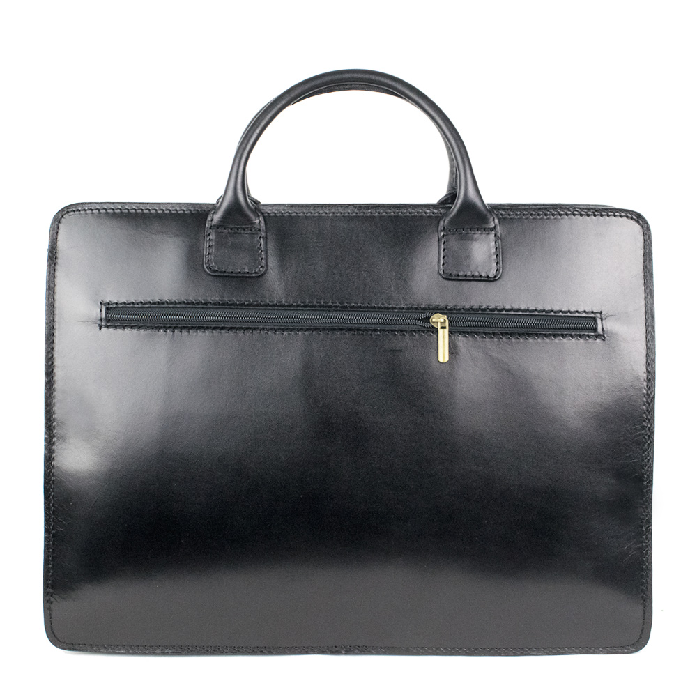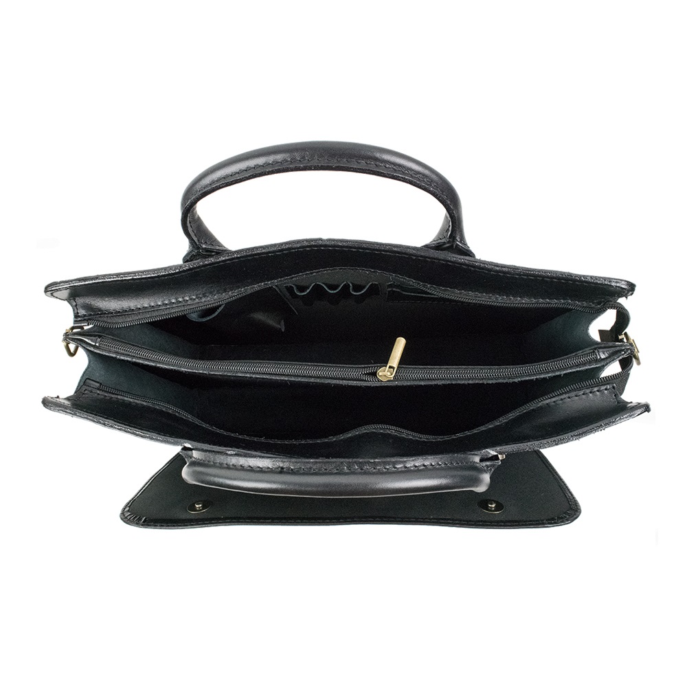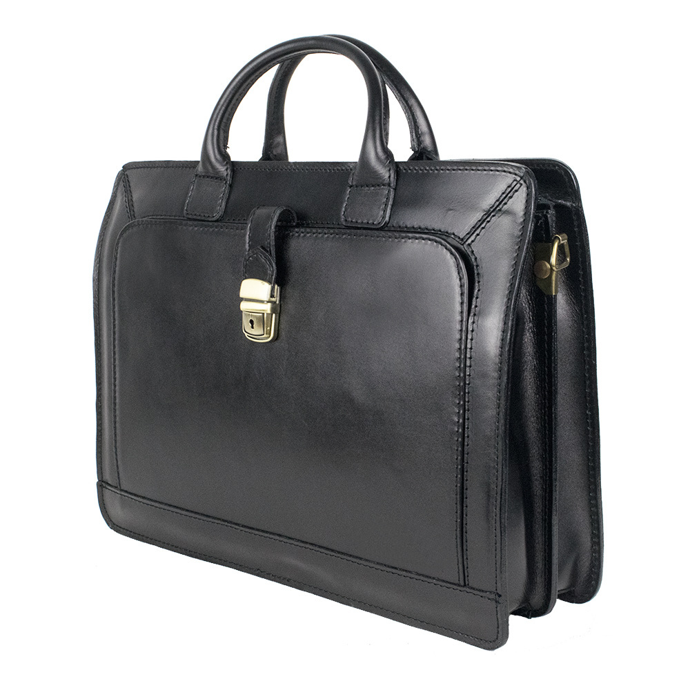 Servieta office din piele naturala, cu doua compartimente inchise cu fermoar, separate de un buzunar inchis cu fermoar, buzunare portstilou, doua portcarduri, buzunar pentru telefon, doua buzunare exterioare, unul frontal inchis cu doua capse si accesoriu metalic si unul pe spate inchis cu fermoar, curea de umar din piele naturala detasabila, doua manere fixe din piele naturala, accesorii aurii. Made in Italy