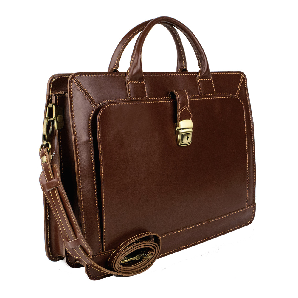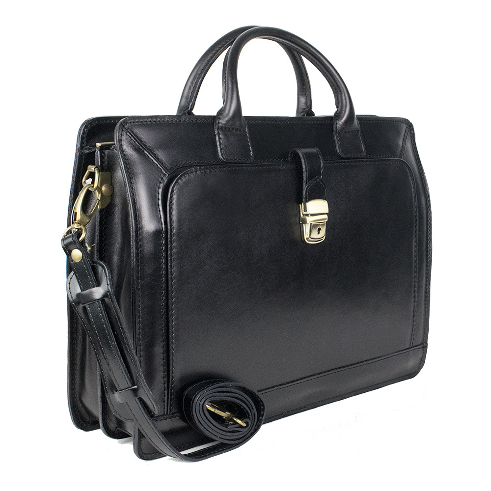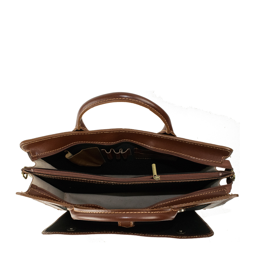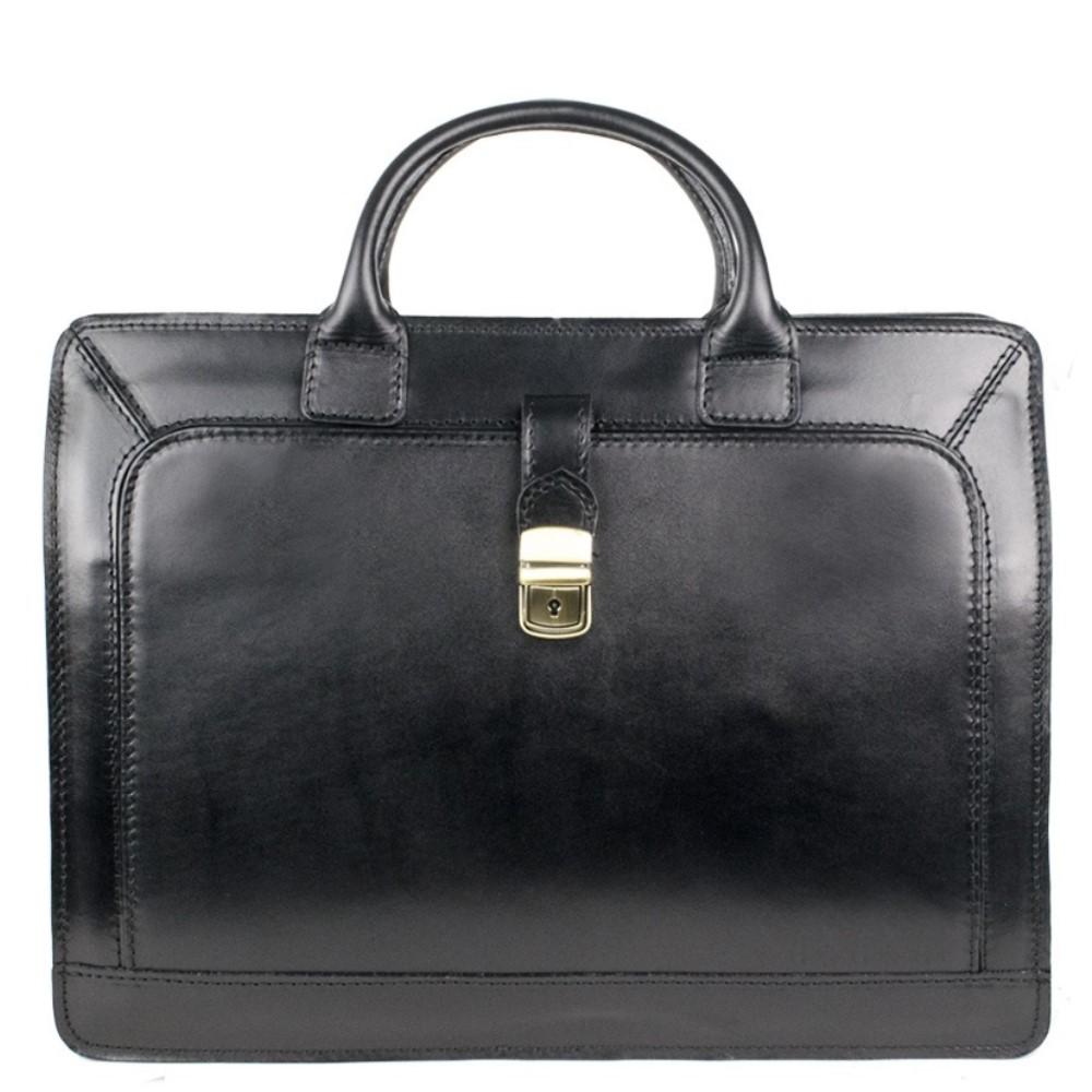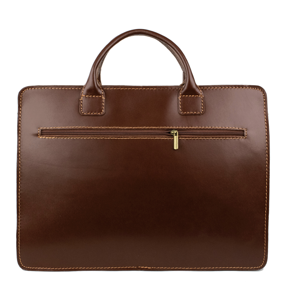 Servieta office din piele naturala, cu doua compartimente inchise cu fermoar, separate de un buzunar inchis cu fermoar, buzunare portstilou, doua portcarduri, buzunar pentru telefon, doua buzunare exterioare, unul frontal inchis cu doua capse si accesoriu metalic si unul pe spate inchis cu fermoar, curea de umar din piele naturala detasabila, doua manere fixe din piele naturala, accesorii aurii. Made in Italy