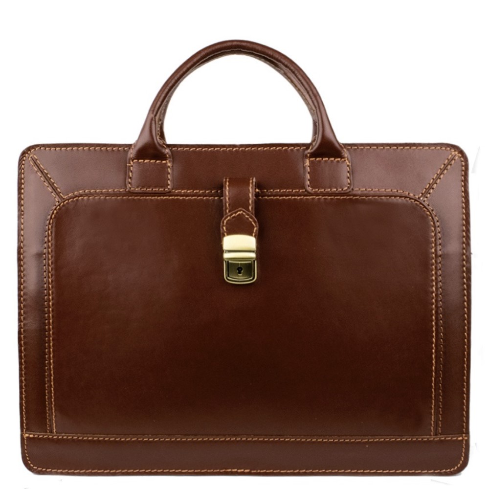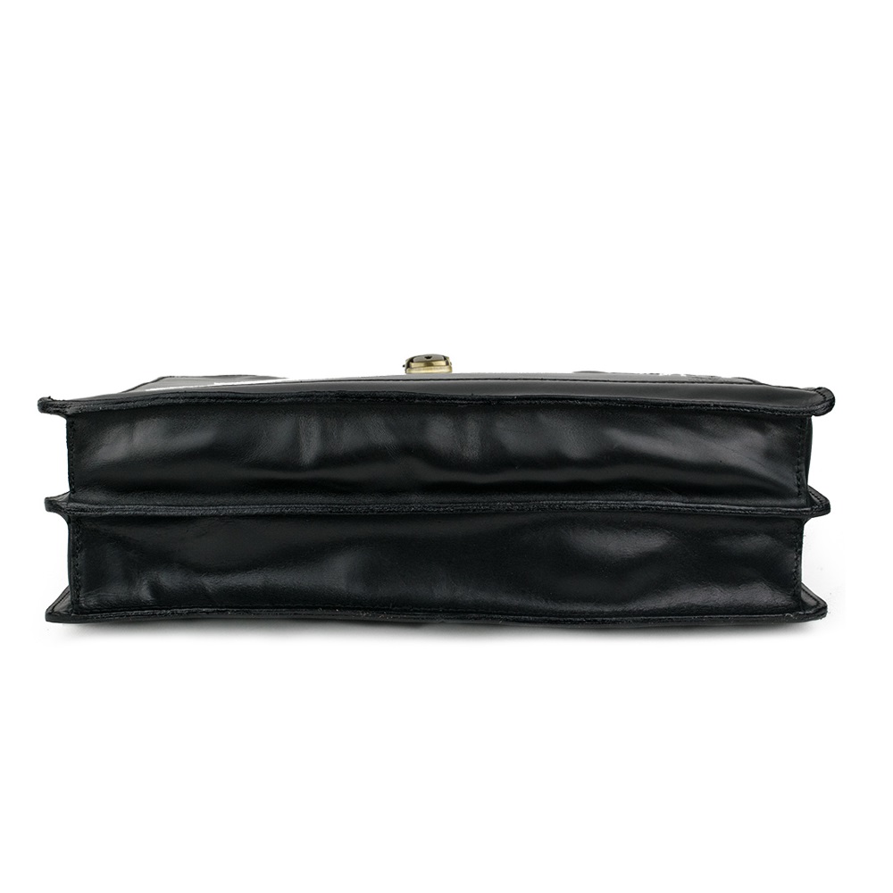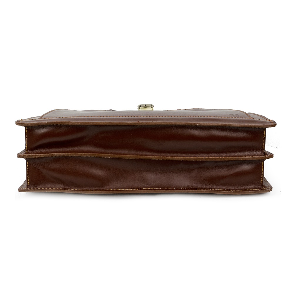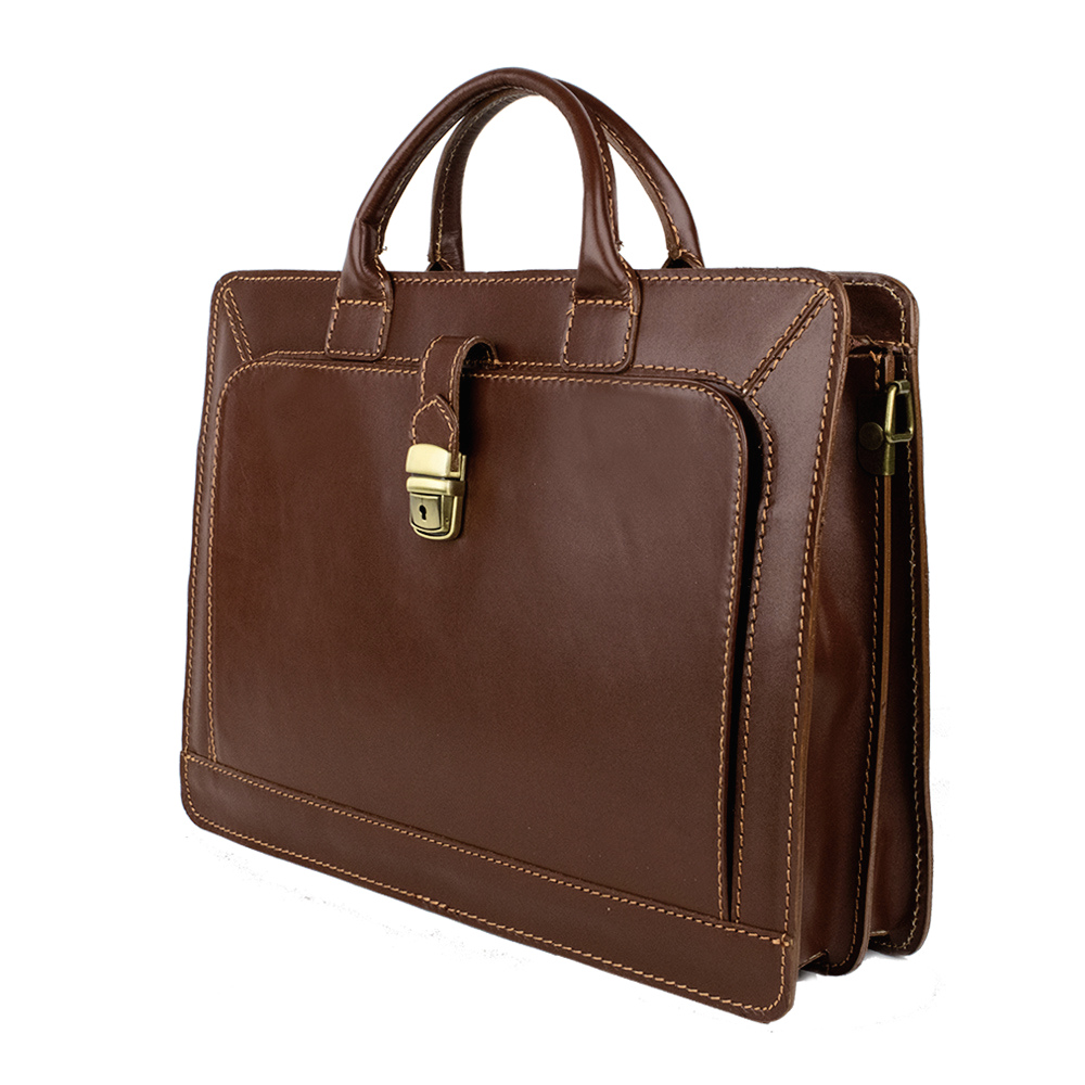 Servieta office din piele naturala, cu doua compartimente inchise cu fermoar, separate de un buzunar inchis cu fermoar, buzunare portstilou, doua portcarduri, buzunar pentru telefon, doua buzunare exterioare, unul frontal inchis cu doua capse si accesoriu metalic si unul pe spate inchis cu fermoar, curea de umar din piele naturala detasabila, doua manere fixe din piele naturala, accesorii aurii. Made in Italy