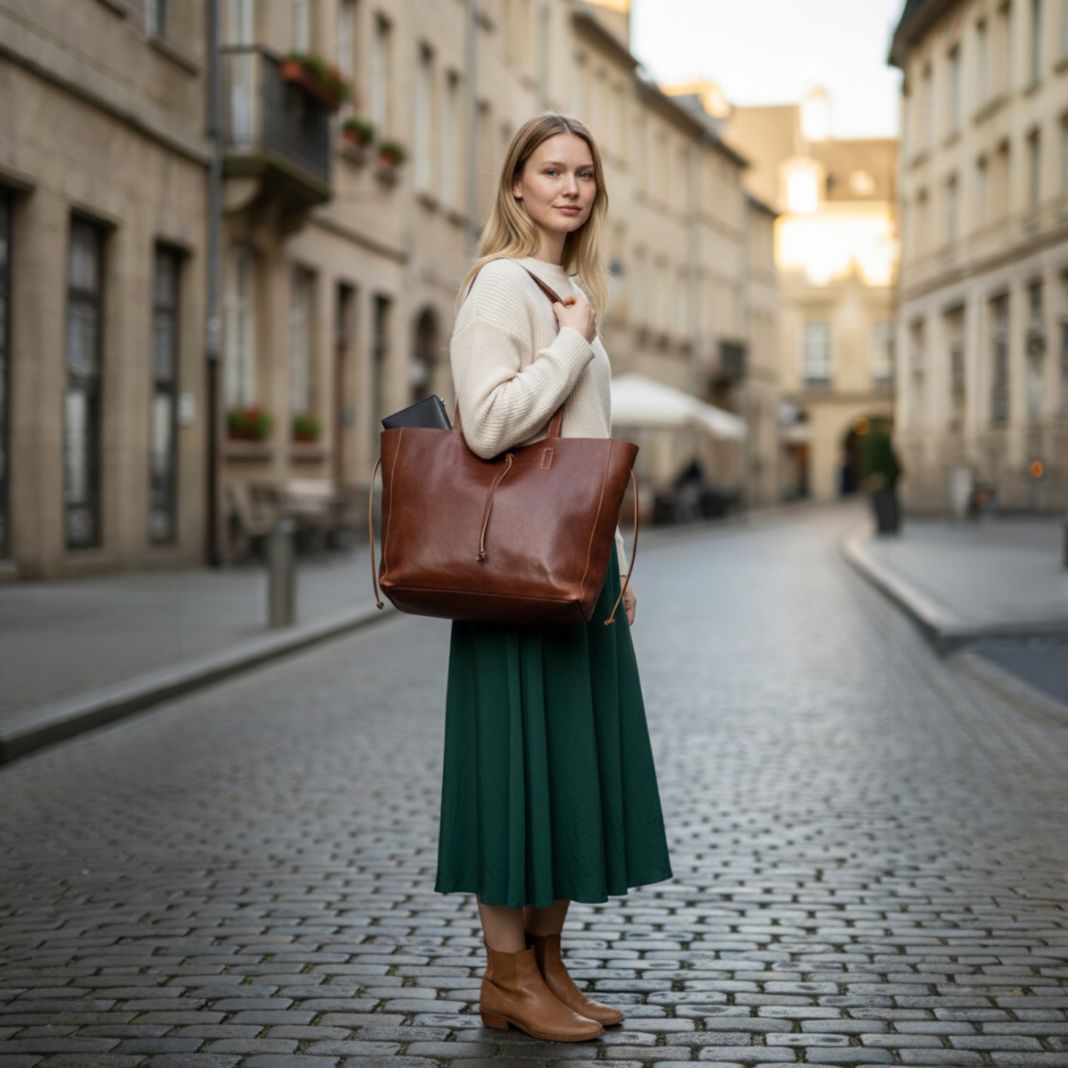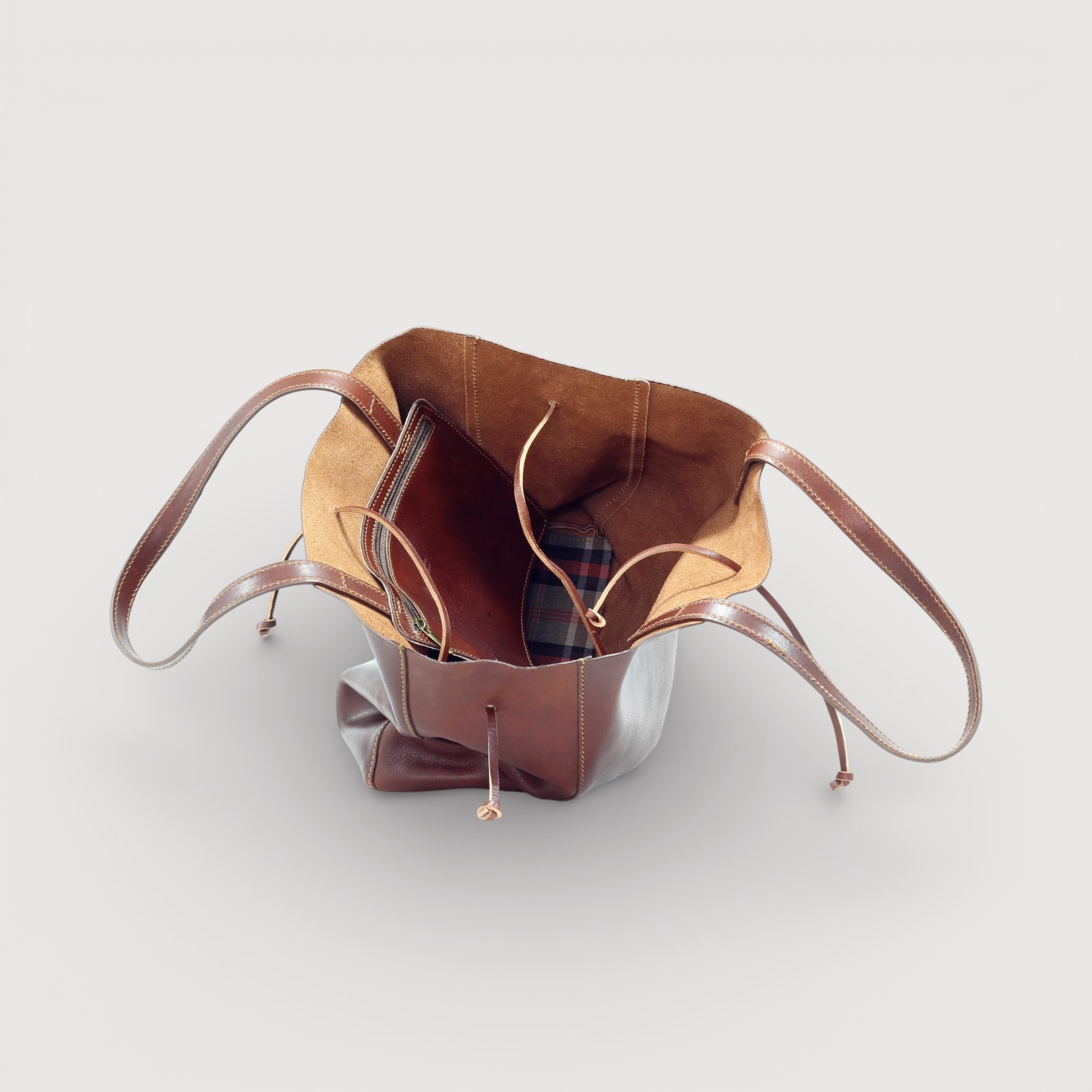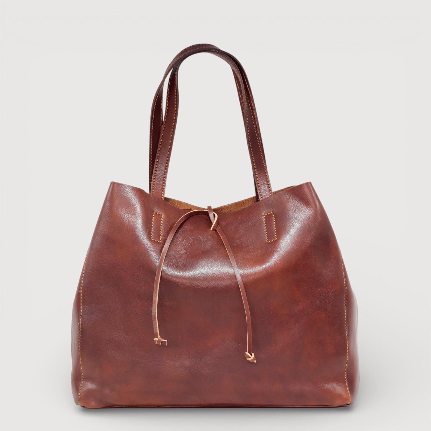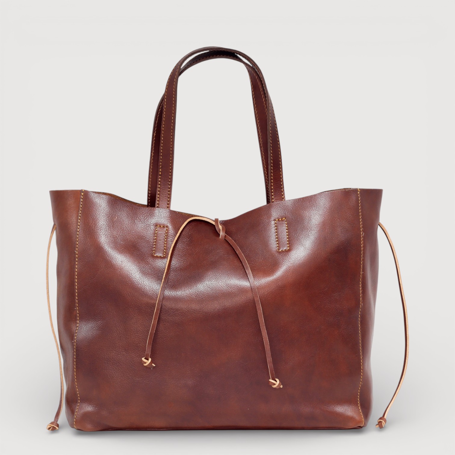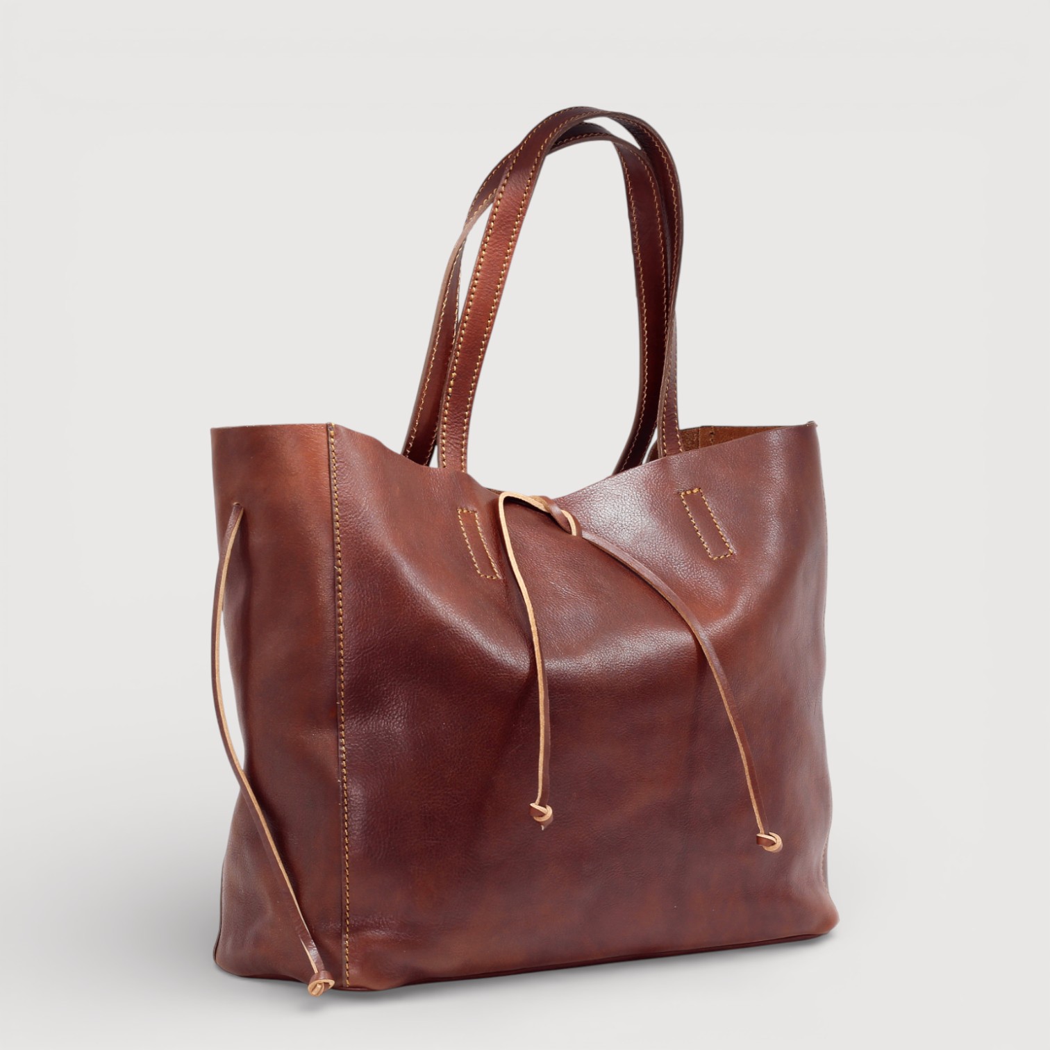 Shopper din piele naturala, cu un compartiment, un buzunar interior, inchidere cu doua/patru cureluse din piele, necaptusita. Made in Italy