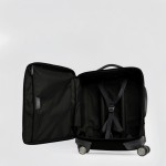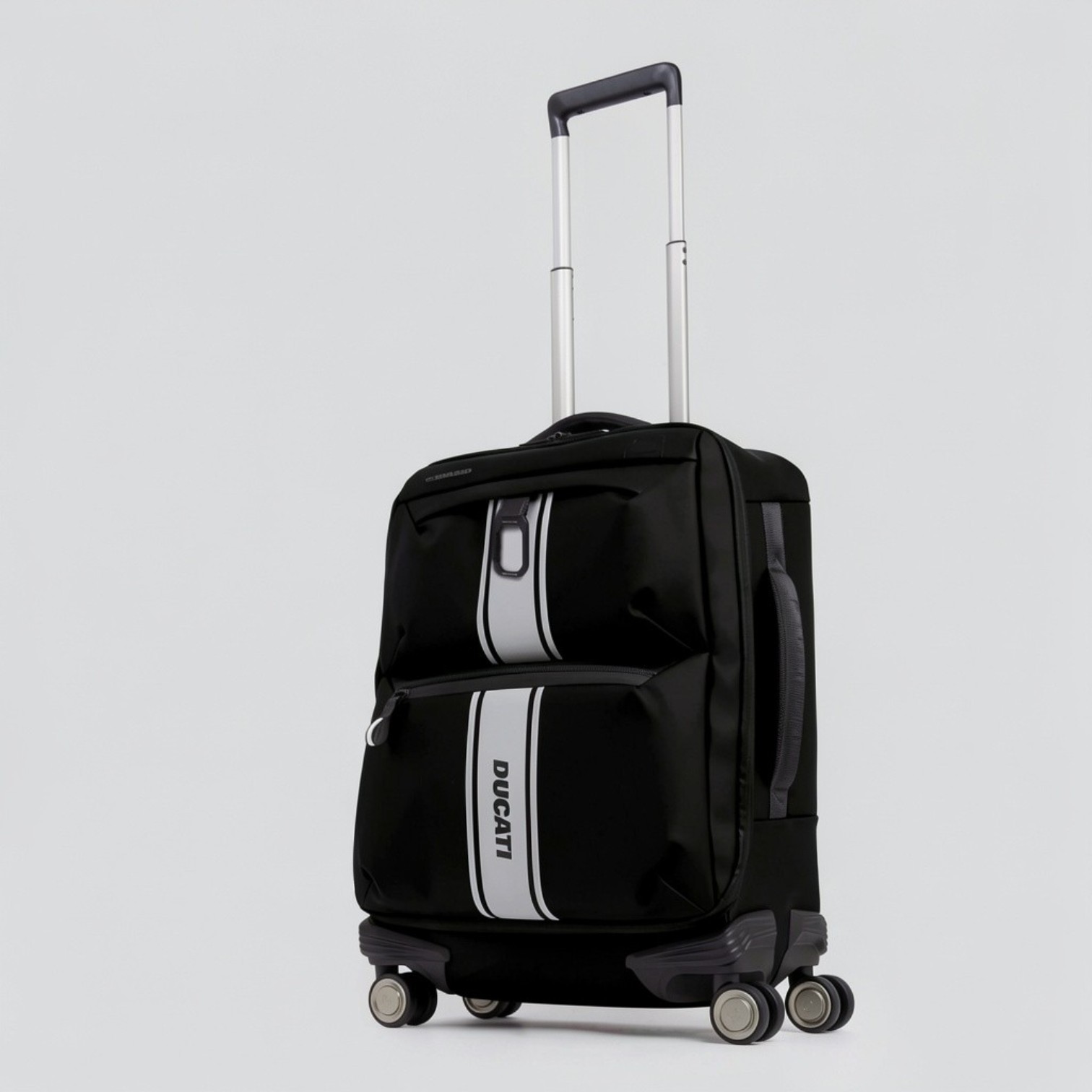 Troler de mână subțire cu 4 roți, în ediție limitată Piquadro x Ducati, din material textil cauciucat, rezistent la apă, cu un compartiment inchis cu fermoar, curele interioare pentru haine, doua buzunare exterioare, doua manere de mana, maner retractabil in doua pozitii, protectie antisoc, 4 roti, volum 32L, greutate 2738gr.